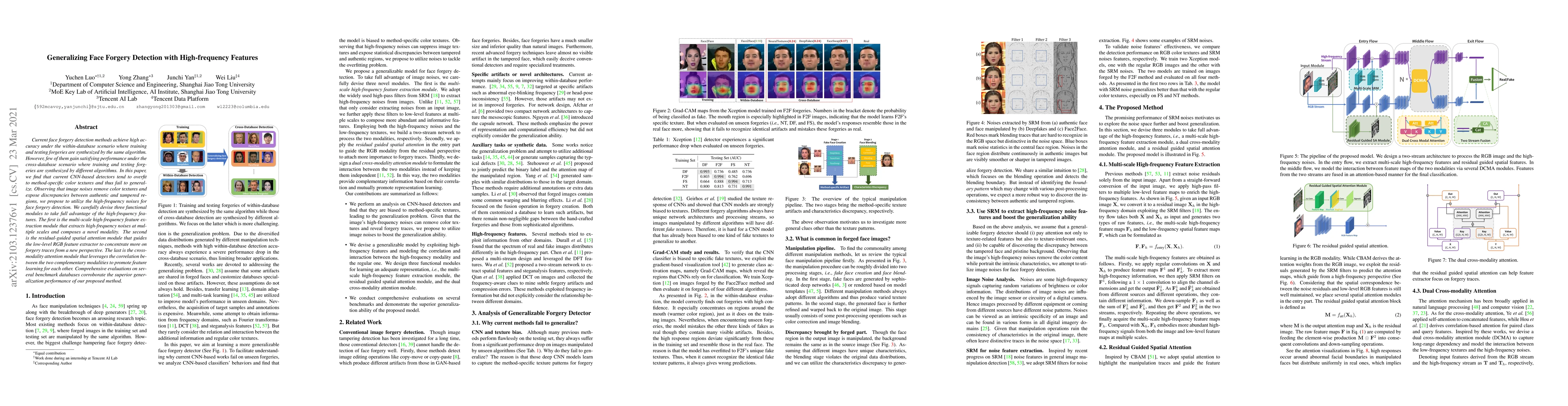 This paper proposes a novel method for face forgery detection that leverages high-frequency noise features to improve generalization across different forgery algorithms. The approach includes multi-scale feature extraction, residual-guided spatial attention, and cross-modality attention to enhance the detection of tampering across databases.