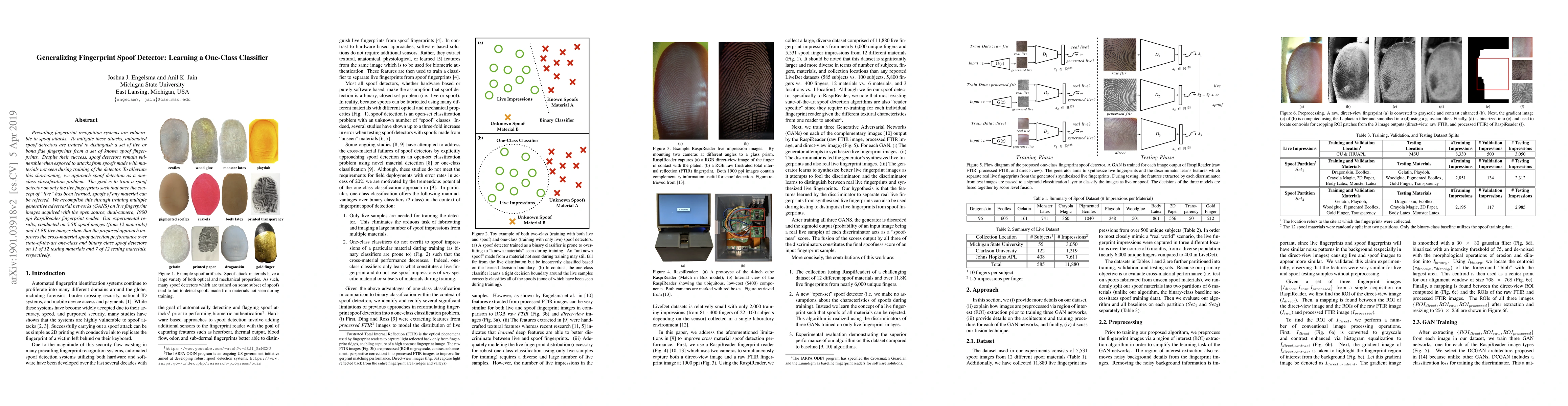 This paper proposes a one-class classifier for fingerprint spoof detection using generative adversarial networks (GANs) trained on live fingerprints to generalize against unseen spoof materials. Experimental results show improved cross-material spoof detection performance compared to state-of-the-art methods.