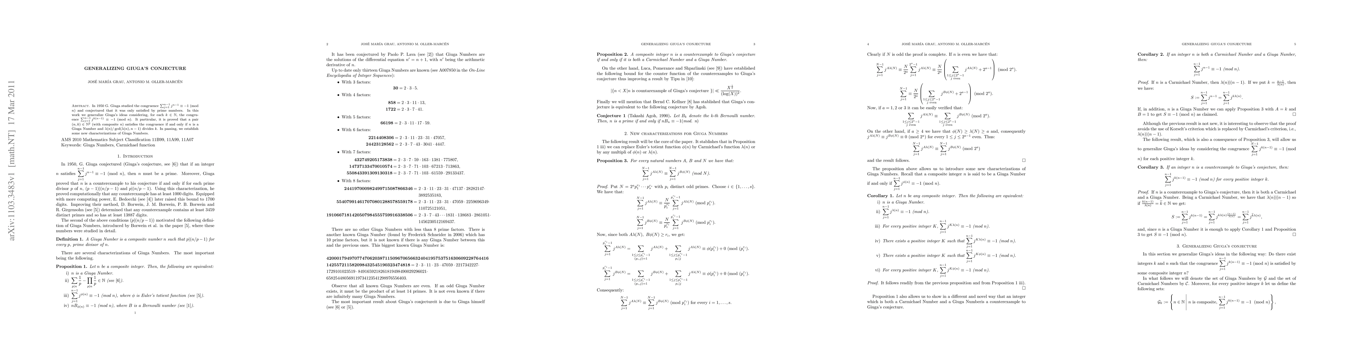 In 1950 G. Giuga studied the congruence $\sum_{j=1}^{n-1} j^{n-1} \equiv -1$ (mod $n$) and conjectured that it was only satisfied by prime numbers. In this work we generalize Giuga's ideas considering, for each $k \in \mathbb{N}$, the congruence $\sum_{j=1}^{n-1} j^{k(n-1)} \equiv -1$ (mod $n$). It particular, it is proved that a pair $(n,k)\in \mathbb{N}^2$ (with composite $n$) satisfies the congruence if and only if $n$ is a Giuga Number and $ \lambda(n)/\gcd(\lambda(n),n-1)$ divides $k$. In passing, we establish some new characterizations of Giuga Numbers.