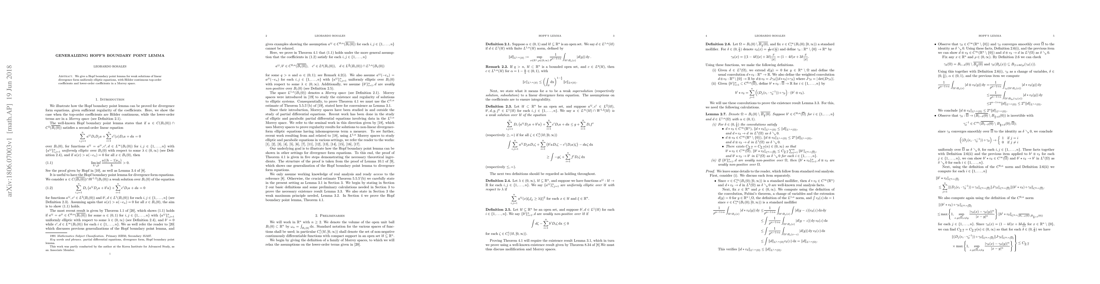 Summary: This paper generalizes Hopf's boundary point lemma to weak solutions of uniformly elliptic linear divergence form equations with Hölder continuous top-order coefficients and Morrey space lower-order coefficients. The result provides a boundary behavior estimate for these solutions.