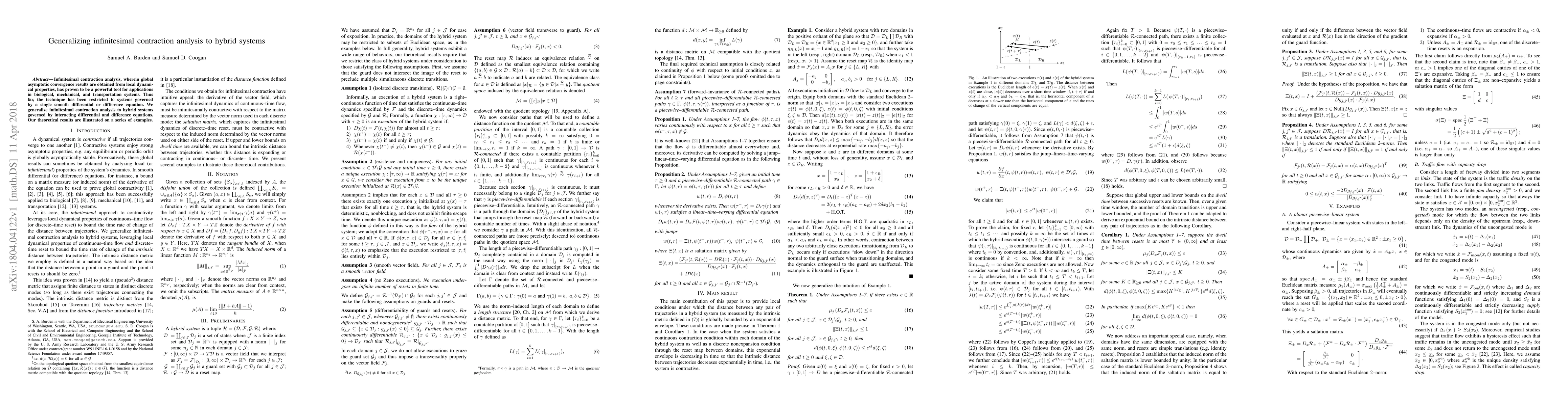 This paper generalizes infinitesimal contraction analysis to hybrid systems, extending its applicability to systems governed by both differential and difference equations. Theoretical results are demonstrated through various examples.