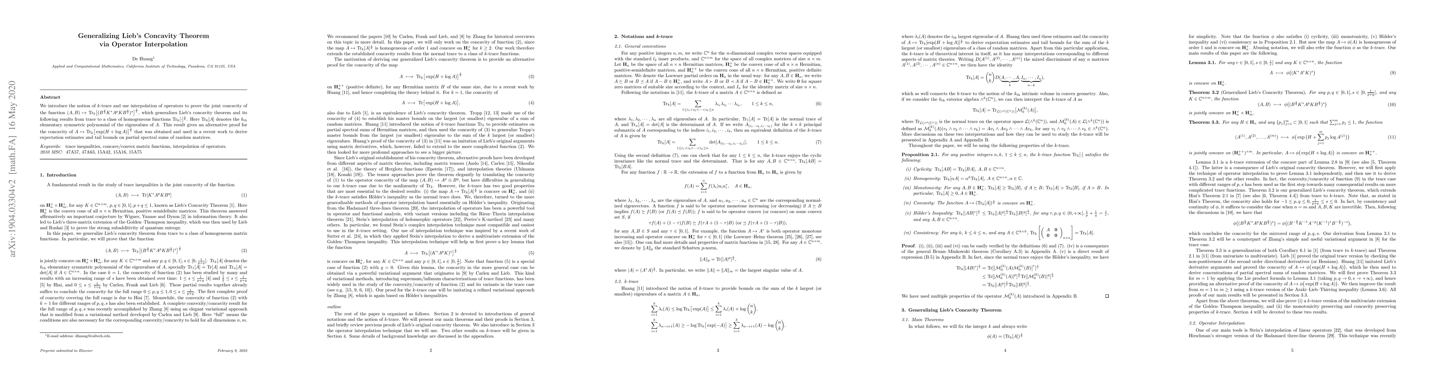 This paper generalizes Lieb's concavity theorem by proving the joint concavity of a function using $k$-trace and operator interpolation, providing an alternative proof for concavity in terms of $k_{\text{th}}$ elementary symmetric polynomials of eigenvalues, and deriving new expectation estimates and tail bounds for random matrices.
