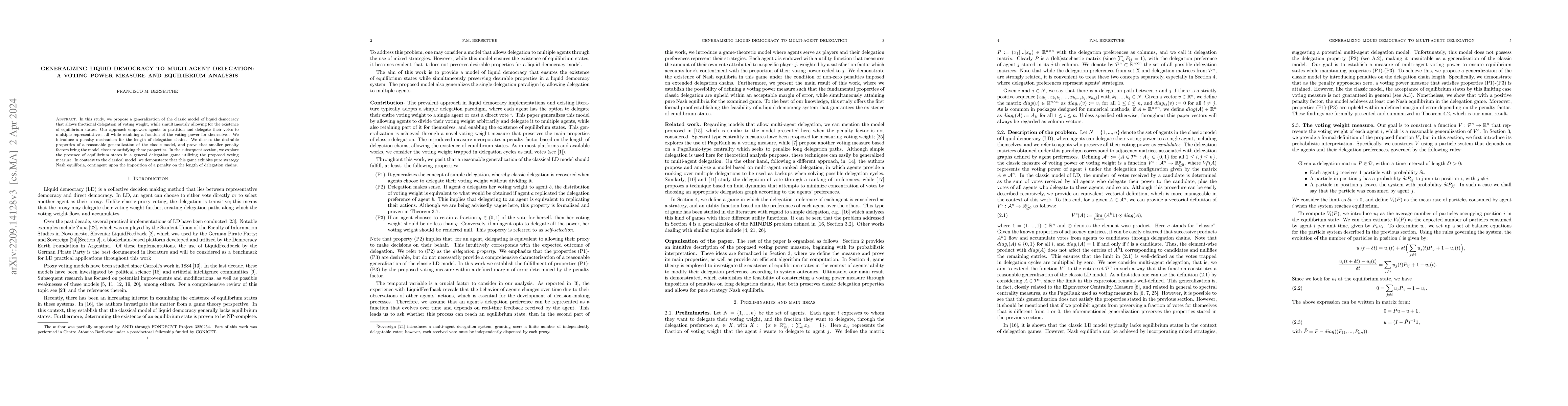 This paper generalizes liquid democracy to multi-agent delegation by allowing fractional voting weight delegation, introducing a penalty mechanism for longer delegation chains, and demonstrating the existence of pure strategy Nash equilibria under specific conditions. The authors argue that smaller penalties enhance the model's desirable properties.