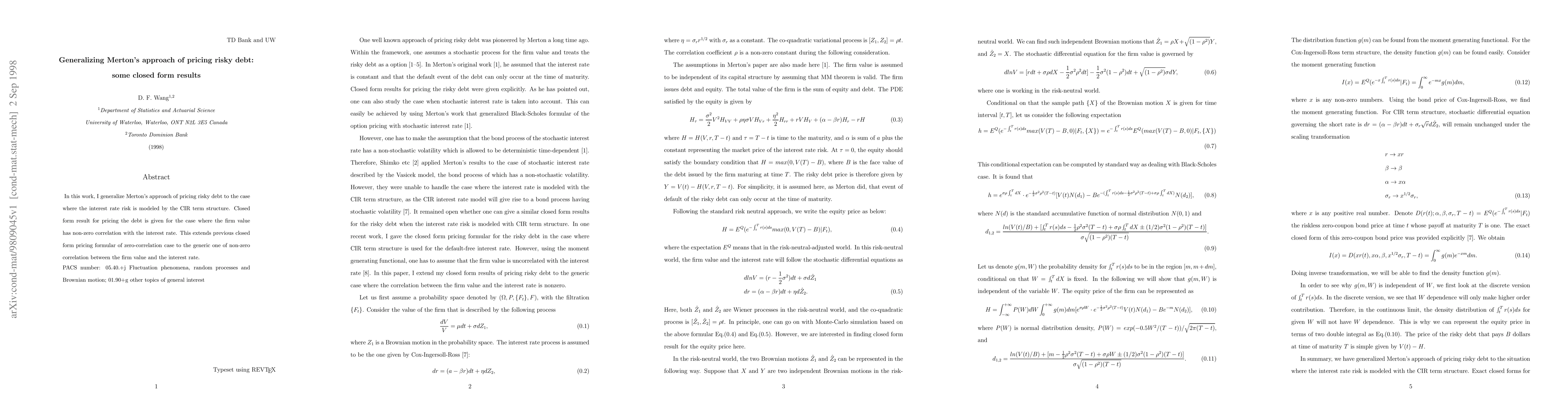 This paper generalizes Merton's risky debt pricing model by incorporating the CIR term structure for interest rate risk, providing closed form results for debt pricing when firm value and interest rate have non-zero correlation. This extends previous models that assumed zero correlation.