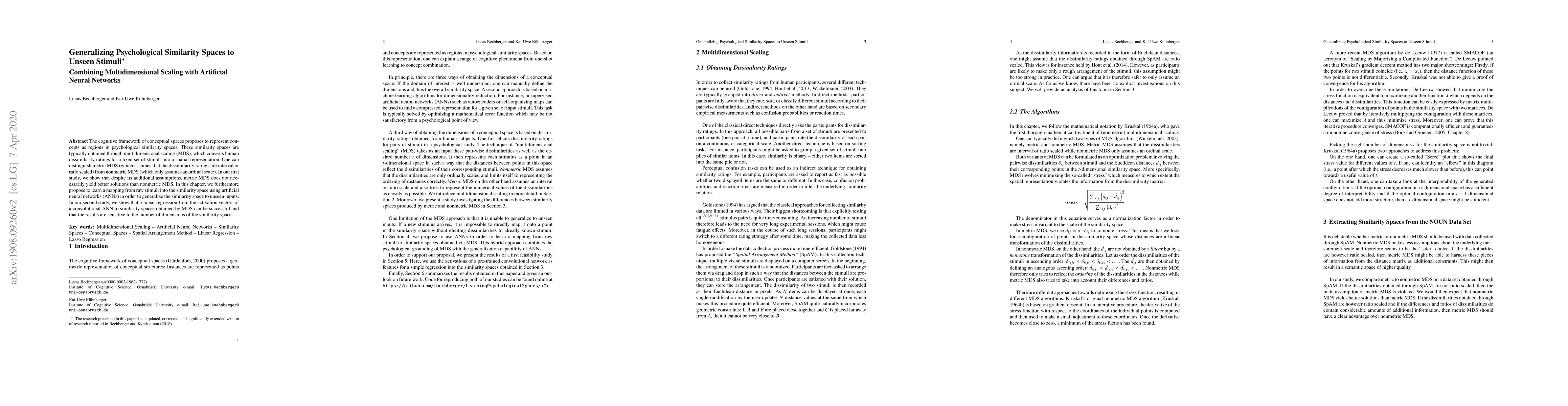 The cognitive framework of conceptual spaces proposes to represent concepts as regions in psychological similarity spaces. These similarity spaces are typically obtained through multidimensional scaling (MDS), which converts human dissimilarity ratings for a fixed set of stimuli into a spatial representation. One can distinguish metric MDS (which assumes that the dissimilarity ratings are interval or ratio scaled) from nonmetric MDS (which only assumes an ordinal scale). In our first study, we show that despite its additional assumptions, metric MDS does not necessarily yield better solutions than nonmetric MDS. In this chapter, we furthermore propose to learn a mapping from raw stimuli into the similarity space using artificial neural networks (ANNs) in order to generalize the similarity space to unseen inputs. In our second study, we show that a linear regression from the activation vectors of a convolutional ANN to similarity spaces obtained by MDS can be successful and that the results are sensitive to the number of dimensions of the similarity space.