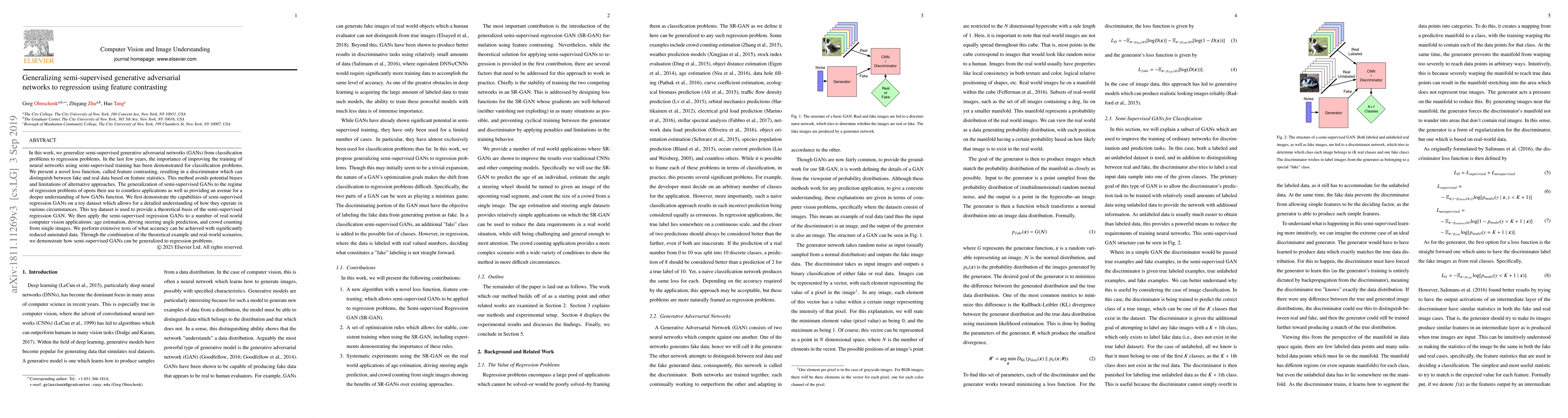 This paper generalizes semi-supervised GANs from classification to regression using a novel feature contrasting loss function, enabling the discriminator to distinguish based on feature statistics. The method is demonstrated on toy and real-world computer vision tasks, showing effective performance with limited annotated data.