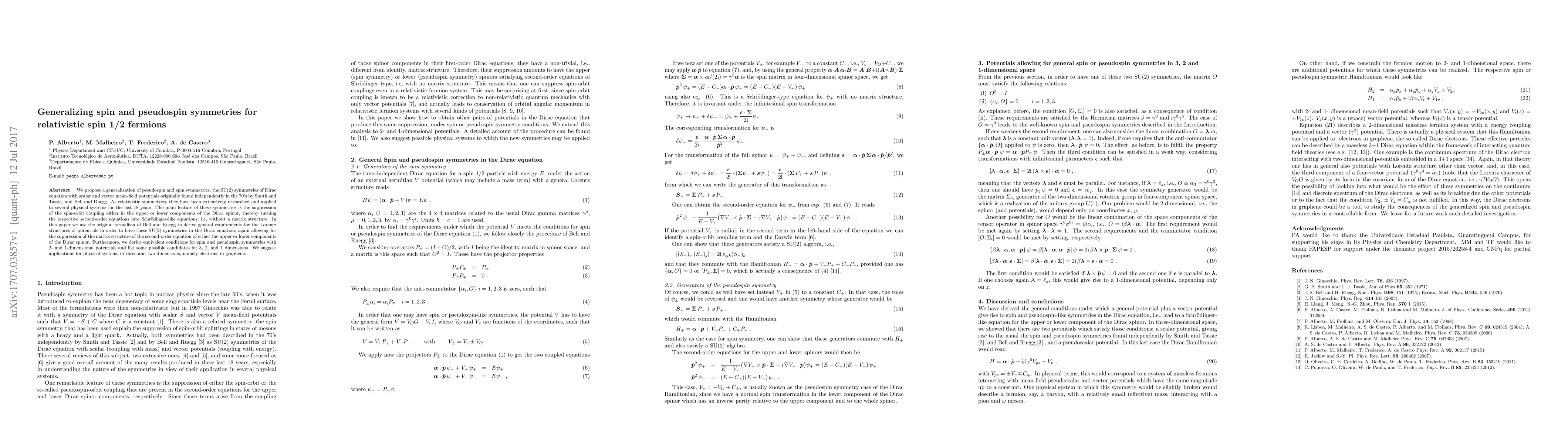 This paper generalizes spin and pseudospin symmetries in the Dirac equation for relativistic spin 1/2 fermions, deriving conditions for Lorentz-invariant potentials that suppress spin-orbit coupling. It proposes applications to electrons in graphene, highlighting the relevance of these symmetries in lower-dimensional physical systems.