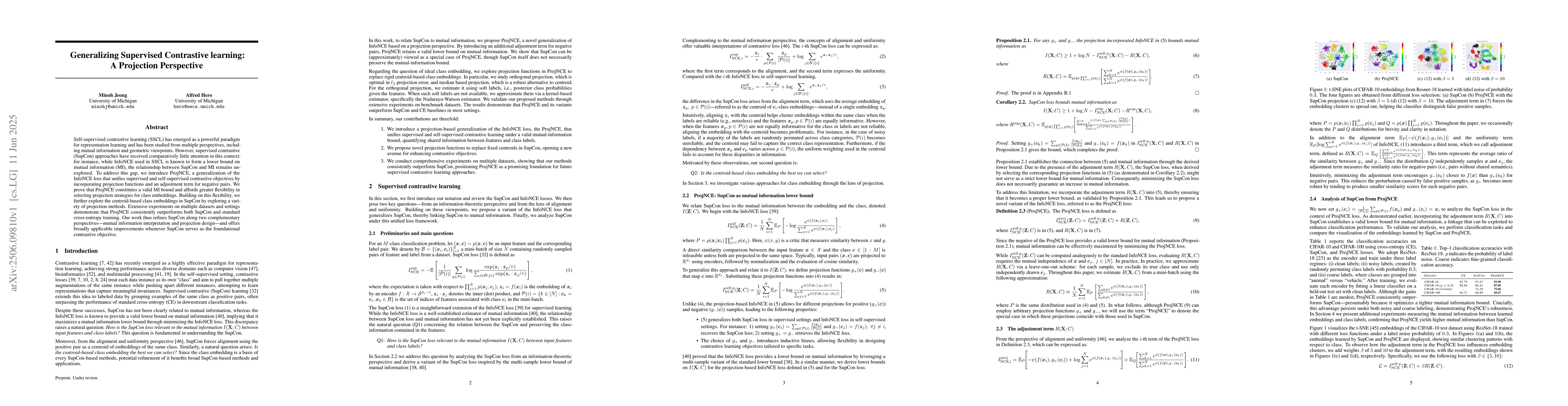 ProjNCE generalizes supervised contrastive learning by incorporating projection functions and improves upon InfoNCE with consistent performance on multiple datasets.