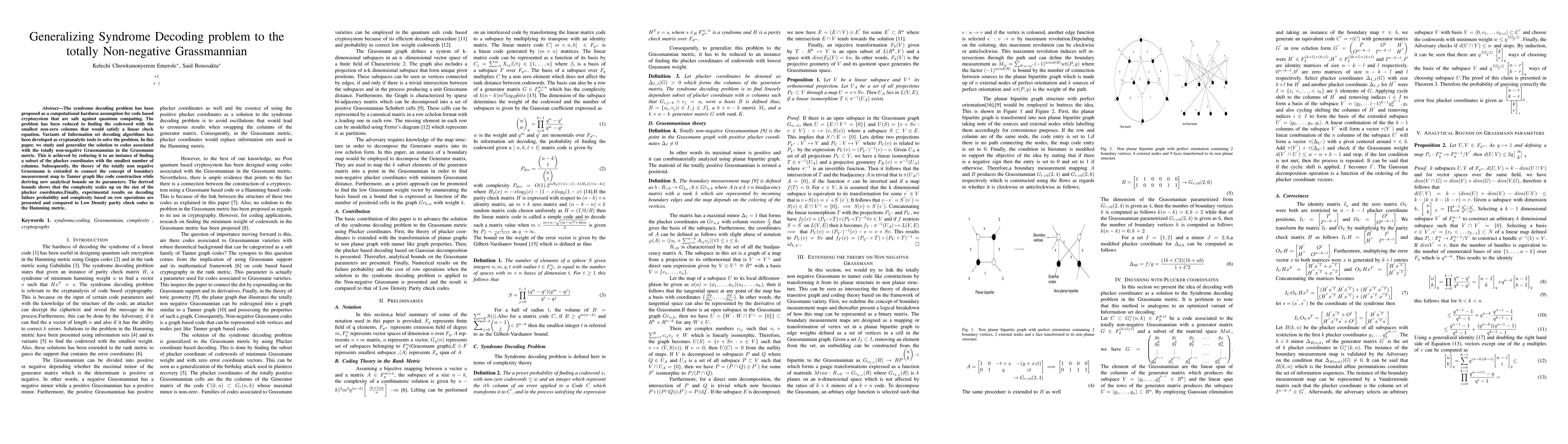 This paper generalizes the syndrome decoding problem to codes associated with the totally non-negative Grassmannian, reducing it to finding a subset of Plucker coordinates with minimal non-zero columns. It extends the theory to derive new analytical bounds and compares experimental results on decoding failure probability and complexity to Low Density Parity Check codes.