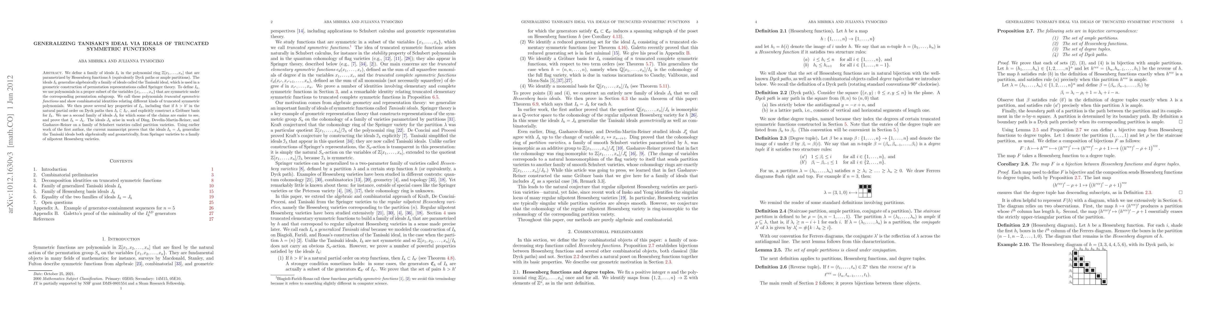 We define a family of ideals $I_h$ in the polynomial ring $\mathbb{Z}[x_1,...,x_n]$ that are parametrized by Hessenberg functions $h$ (equivalently Dyck paths or ample partitions). The ideals $I_h$ generalize algebraically a family of ideals called the Tanisaki ideal, which is used in a geometric construction of permutation representations called Springer theory. To define $I_h$, we use polynomials in a proper subset of the variables ${x_1,...,x_n}$ that are symmetric under the corresponding permutation subgroup. We call these polynomials {\em truncated symmetric functions} and show combinatorial identities relating different kinds of truncated symmetric polynomials. We then prove several key properties of $I_h$, including that if $h>h'$ in the natural partial order on Dyck paths then $I_{h} \subset I_{h'}$, and explicitly construct a Gr\"{o}bner basis for $I_h$. We use a second family of ideals $J_h$ for which some of the claims are easier to see, and prove that $I_h = J_h$. The ideals $J_h$ arise in work of Ding, Develin-Martin-Reiner, and Gasharov-Reiner on a family of Schubert varieties called partition varieties. Using earlier work of the first author, the current manuscript proves that the ideals $I_h = J_h$ generalize the Tanisaki ideals both algebraically and geometrically, from Springer varieties to a family of nilpotent Hessenberg varieties.