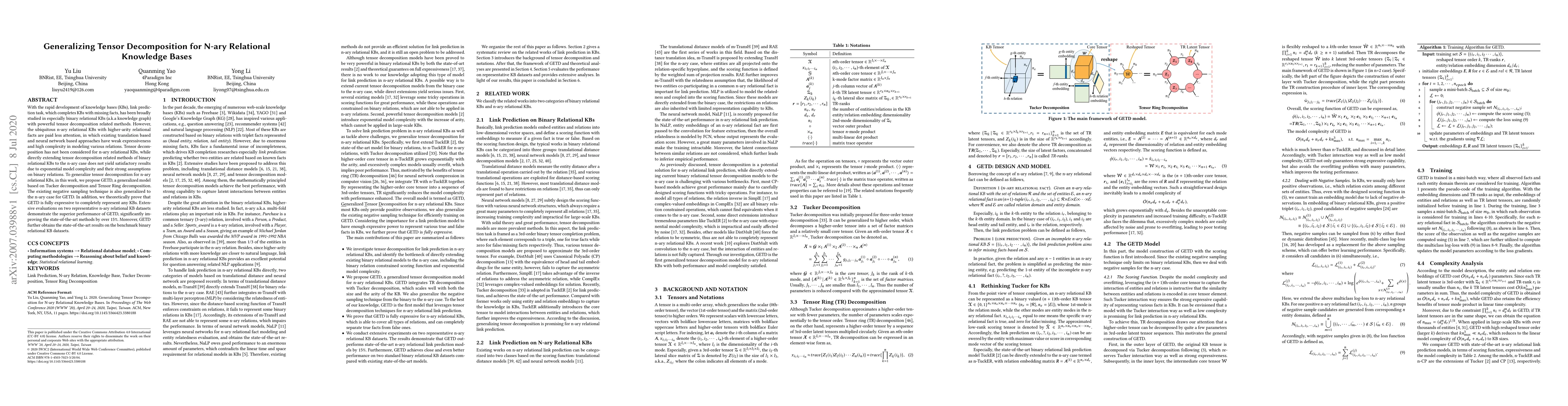 This paper proposes GETD, a generalized tensor decomposition model combining Tucker and Tensor Ring decompositions, to effectively handle n-ary relational knowledge bases. The method outperforms existing approaches by fully representing n-ary relations, achieving state-of-the-art results on both n-ary and binary datasets.