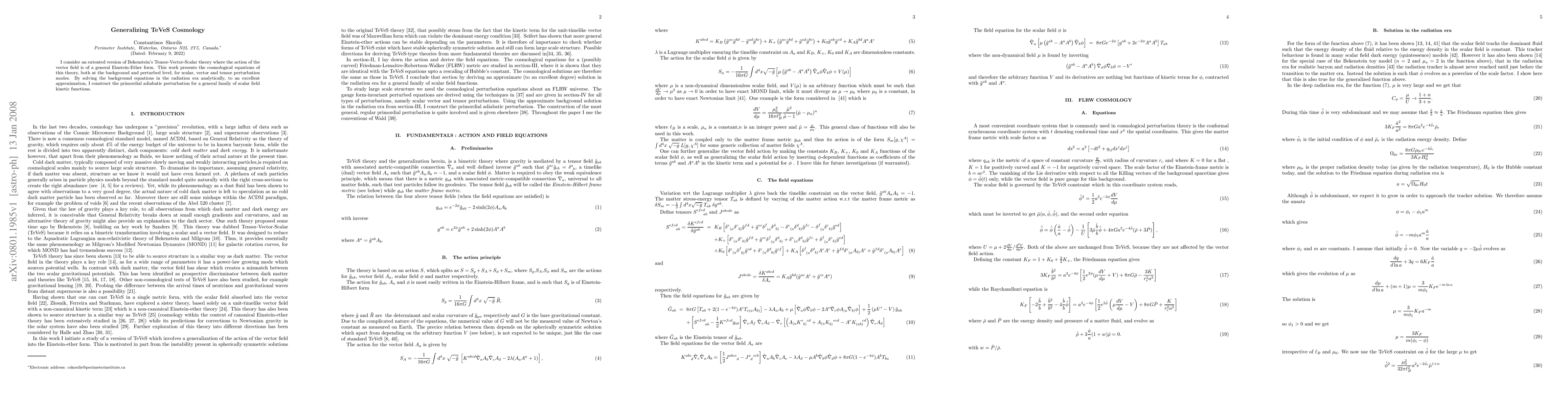 I consider an extented version of Bekenstein's Tensor-Vector-Scalar theory where the action of the vector field is of a general Einstein-Ether form. This work presents the cosmological equations of this theory, both at the background and perturbed level, for scalar, vector and tensor perturbation modes. By solving the background equations in the radiation era analytically, to an excellent approximation, I construct the primordial adiabatic perturbation for a general family of scalar field kinetic functions.