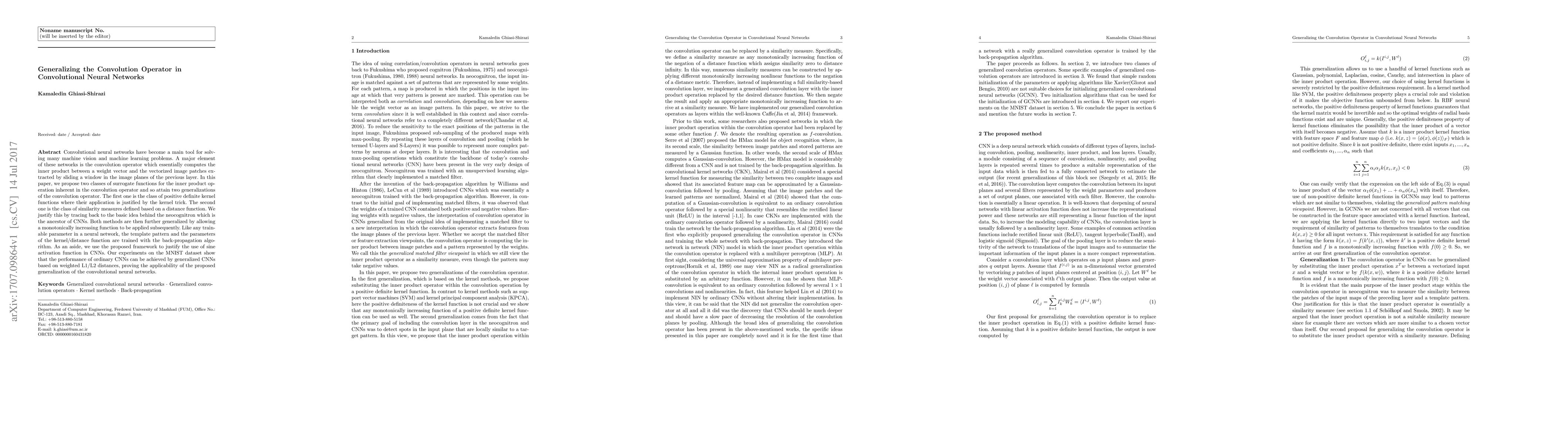 This paper proposes two classes of surrogate functions for the convolution operator in CNNs: positive definite kernel functions and similarity measures based on distance functions. Experiments on the MNIST dataset demonstrate that generalized CNNs can achieve the performance of ordinary CNNs.
