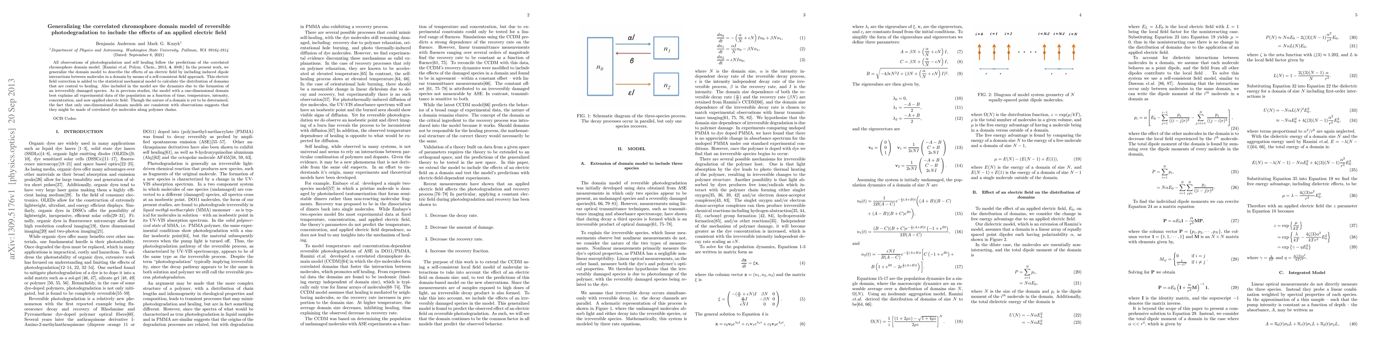 All observations of photodegradation and self healing follow the predictions of the correlated chromophore domain model. [Ramini et.al. Polym. Chem., 2013, 4, 4948.] In the present work, we generalize the domain model to describe the effects of an electric field by including induced dipole interactions between molecules in a domain by means of a self-consistent field approach. This electric field correction is added to the statistical mechanical model to calculate the distribution of domains that are central to healing. Also included in the model are the dynamics due to the formation of an irreversibly damaged species. As in previous studies, the model with a one-dimensional domain best explains all experimental data of the population as a function of time, temperature, intensity, concentration, and now applied electric field. Though the nature of a domain is yet to be determined, the fact that only one-dimensional domain models are consistent with observations suggests that they might be made of correlated dye molecules along polymer chains.