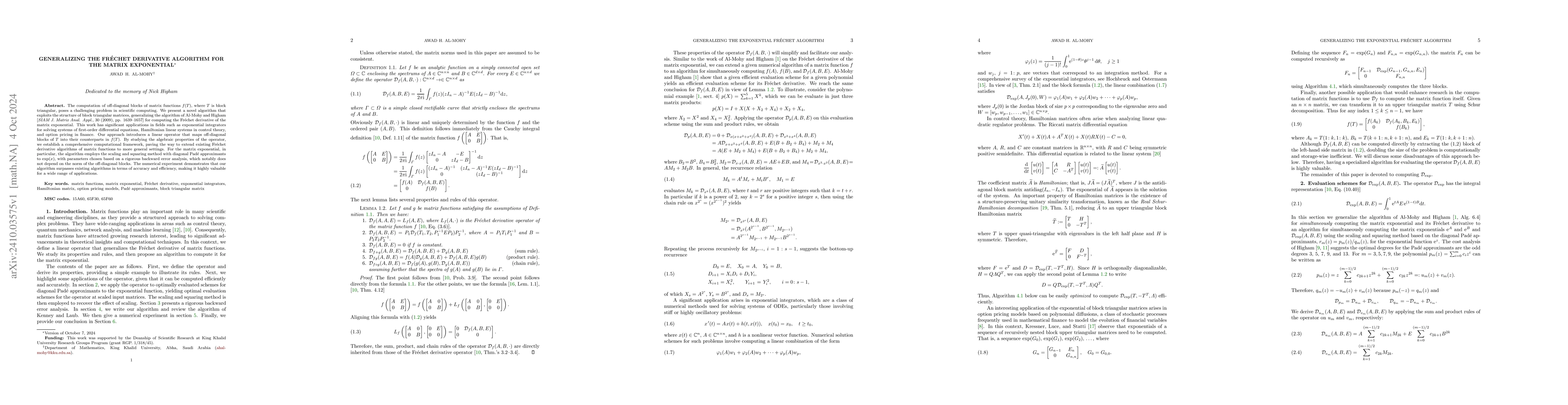 This paper introduces a new algorithm for computing off-diagonal blocks of matrix functions for block triangular matrices, generalizing the Fréchet derivative of the matrix exponential. The algorithm improves existing methods, showing enhanced accuracy and efficiency, with applications in differential equations, control theory, and finance.