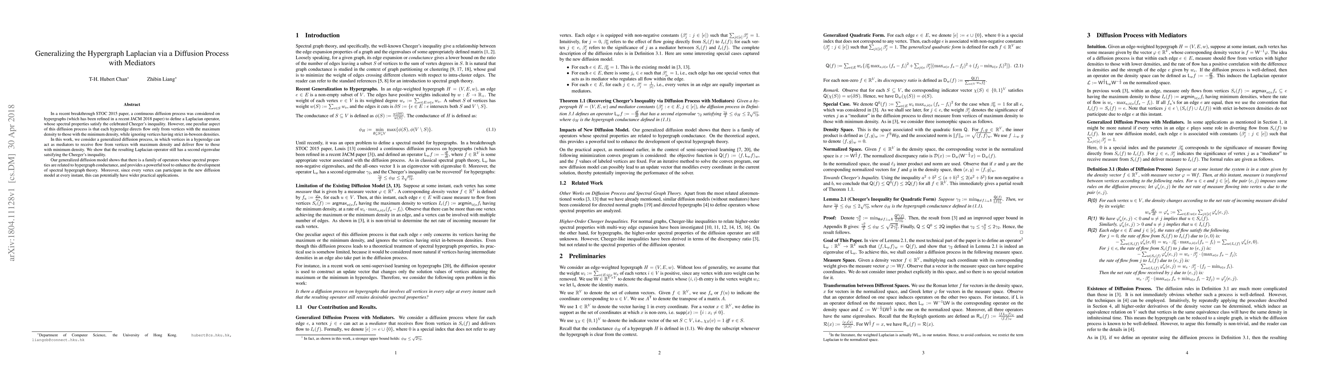 In a recent breakthrough STOC~2015 paper, a continuous diffusion process was considered on hypergraphs (which has been refined in a recent JACM 2018 paper) to define a Laplacian operator, whose spectral properties satisfy the celebrated Cheeger's inequality. However, one peculiar aspect of this diffusion process is that each hyperedge directs flow only from vertices with the maximum density to those with the minimum density, while ignoring vertices having strict in-beween densities. In this work, we consider a generalized diffusion process, in which vertices in a hyperedge can act as mediators to receive flow from vertices with maximum density and deliver flow to those with minimum density. We show that the resulting Laplacian operator still has a second eigenvalue satsifying the Cheeger's inequality. Our generalized diffusion model shows that there is a family of operators whose spectral properties are related to hypergraph conductance, and provides a powerful tool to enhance the development of spectral hypergraph theory. Moreover, since every vertex can participate in the new diffusion model at every instant, this can potentially have wider practical applications.