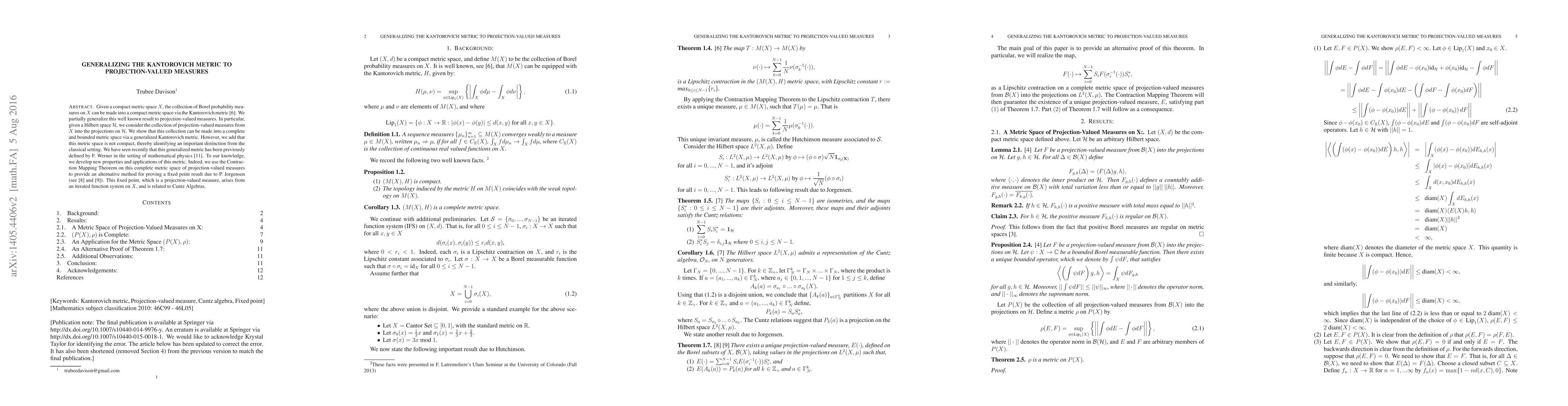 Given a compact metric space $X$, the collection of Borel probability measures on $X$ can be made into a compact metric space via the Kantorovich metric. We partially generalize this well known result to projection-valued measures. In particular, given a Hilbert space $\mathcal{H}$, we consider the collection of projection-valued measures from $X$ into the projections on $\mathcal{H}$. We show that this collection can be made into a complete and bounded metric space via a generalized Kantorovich metric. However, we add that this metric space is not compact, thereby identifying an important distinction from the classical setting. We have seen recently that this generalized metric has been previously defined by F. Werner in the setting of mathematical physics. To our knowledge, we develop new properties and applications of this metric. Indeed, we use the Contraction Mapping Theorem on this complete metric space of projection-valued measures to provide an alternative method for proving a fixed point result due to P. Jorgensen. This fixed point, which is a projection-valued measure, arises from an iterated function system on $X$, and is related to Cuntz Algebras.