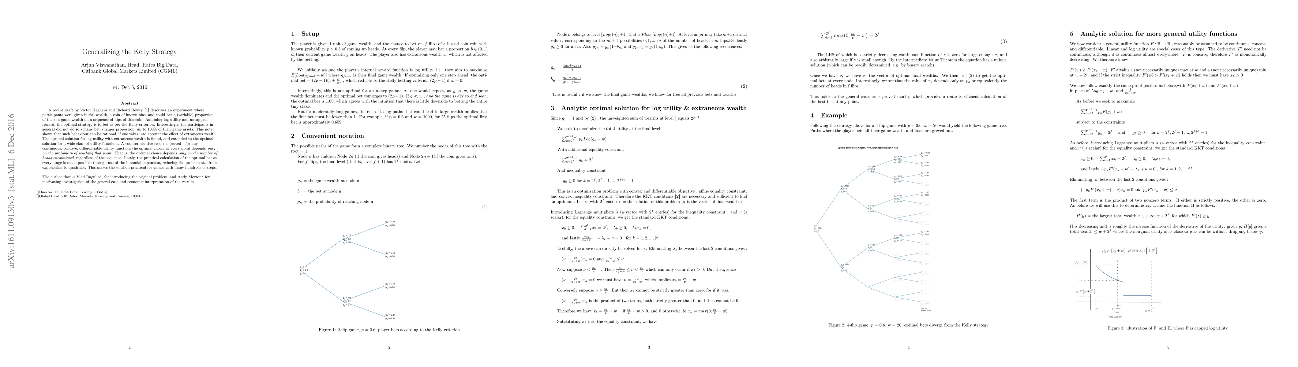 Prompted by a recent experiment by Victor Haghani and Richard Dewey, this note generalises the Kelly strategy (optimal for simple investment games with log utility) to a large class of practical utility functions and including the effect of extraneous wealth. A counterintuitive result is proved : for any continuous, concave, differentiable utility function, the optimal choice at every point depends only on the probability of reaching that point. The practical calculation of the optimal action at every stage is made possible through use of the binomial expansion, reducing the problem size from exponential to quadratic. Applications include (better) automatic investing and risk taking under uncertainty.