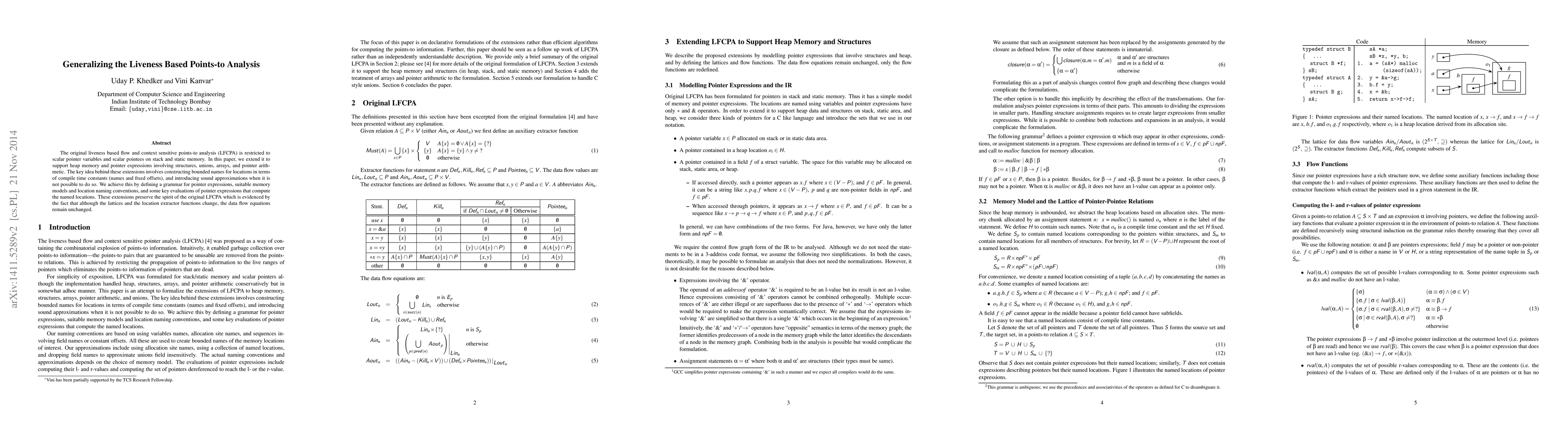 This paper extends liveness-based points-to analysis to support heap memory and pointer expressions involving structures, unions, arrays, and arithmetic, preserving the original's spirit while allowing for more complex data flow equations.
