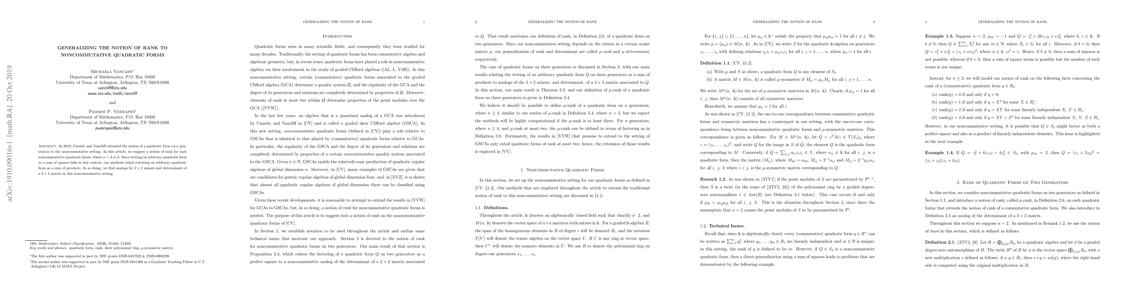 In 2010, Cassidy and Vancliff extended the notion of a quadratic form on n generators to the noncommutative setting. In this article, we suggest a notion of rank for such noncommutative quadratic forms, where n = 2 or 3. Since writing an arbitrary quadratic form as a sum of squares fails in this context, our methods entail rewriting an arbitrary quadratic form as a sum of products. In so doing, we find analogs for 2 x 2 minors and determinant of a 3 x 3 matrix in this noncommutative setting.