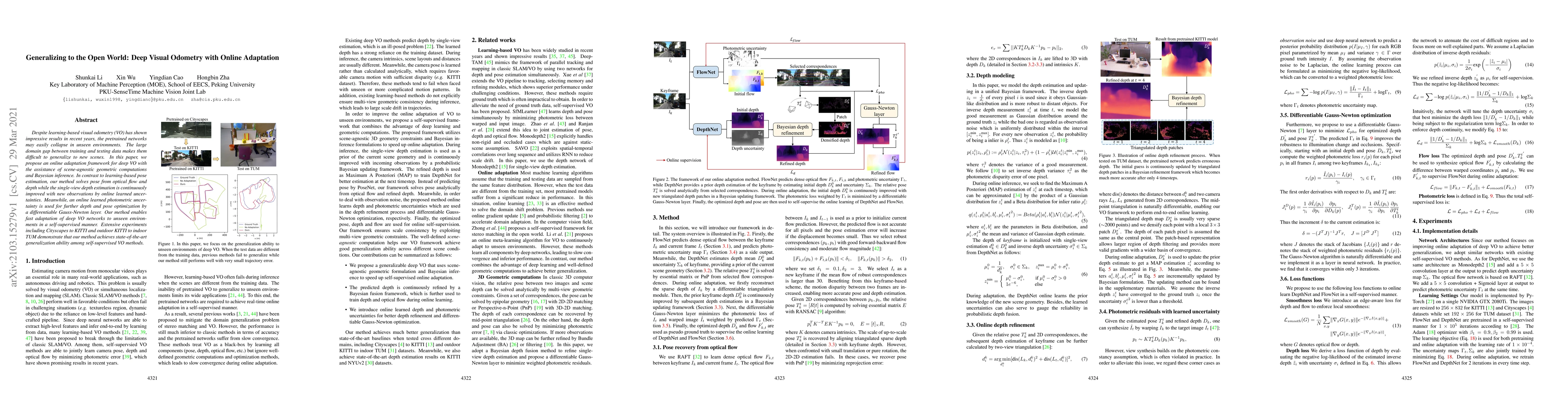 This paper proposes an online adaptation framework for deep visual odometry that enhances generalization to unseen environments. The method combines scene-agnostic geometric computations and Bayesian inference to continuously improve depth estimation and pose estimation through self-supervised learning, achieving state-of-the-art performance across diverse datasets.