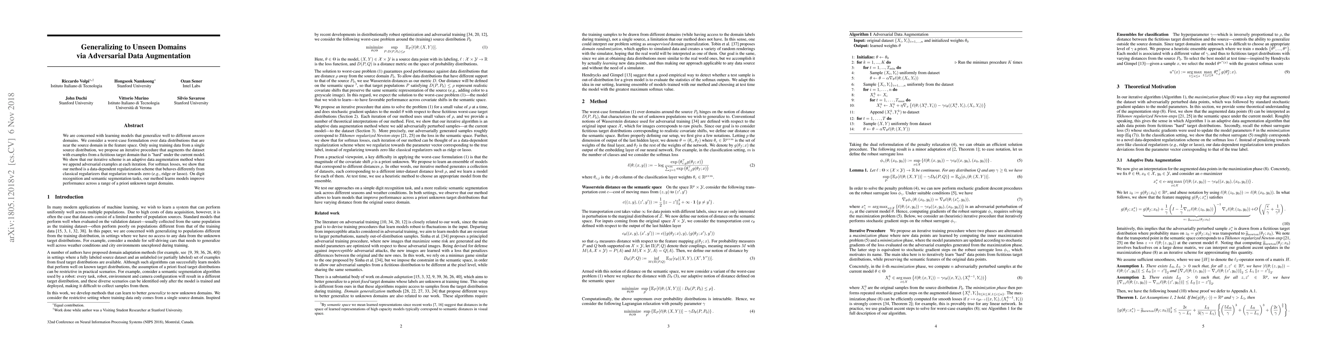 We are concerned with learning models that generalize well to different \emph{unseen} domains. We consider a worst-case formulation over data distributions that are near the source domain in the feature space. Only using training data from a single source distribution, we propose an iterative procedure that augments the dataset with examples from a fictitious target domain that is "hard" under the current model. We show that our iterative scheme is an adaptive data augmentation method where we append adversarial examples at each iteration. For softmax losses, we show that our method is a data-dependent regularization scheme that behaves differently from classical regularizers that regularize towards zero (e.g., ridge or lasso). On digit recognition and semantic segmentation tasks, our method learns models improve performance across a range of a priori unknown target domains.