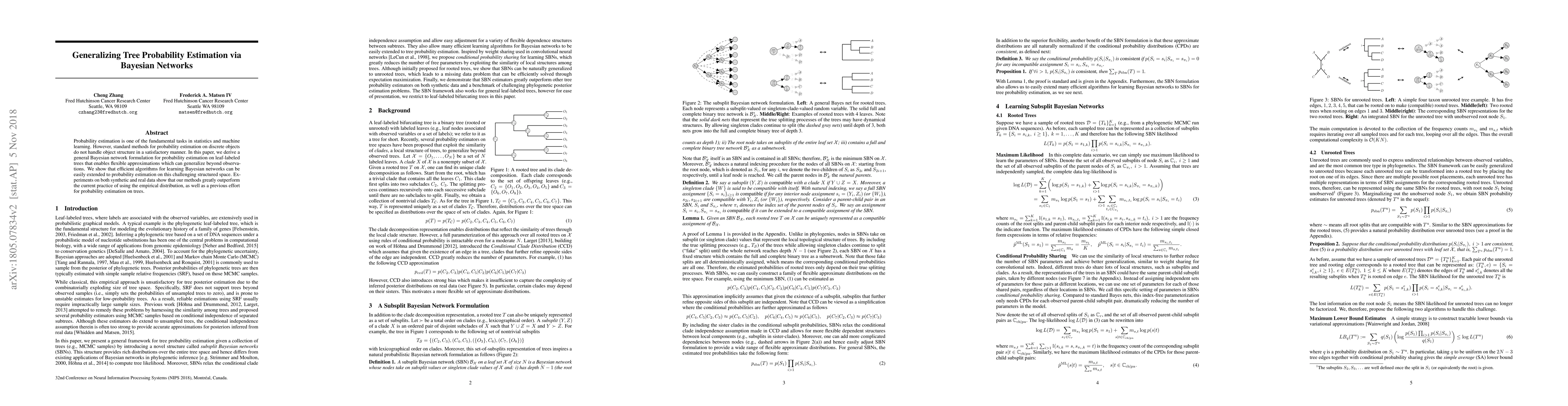 Probability estimation is one of the fundamental tasks in statistics and machine learning. However, standard methods for probability estimation on discrete objects do not handle object structure in a satisfactory manner. In this paper, we derive a general Bayesian network formulation for probability estimation on leaf-labeled trees that enables flexible approximations which can generalize beyond observations. We show that efficient algorithms for learning Bayesian networks can be easily extended to probability estimation on this challenging structured space. Experiments on both synthetic and real data show that our methods greatly outperform the current practice of using the empirical distribution, as well as a previous effort for probability estimation on trees.