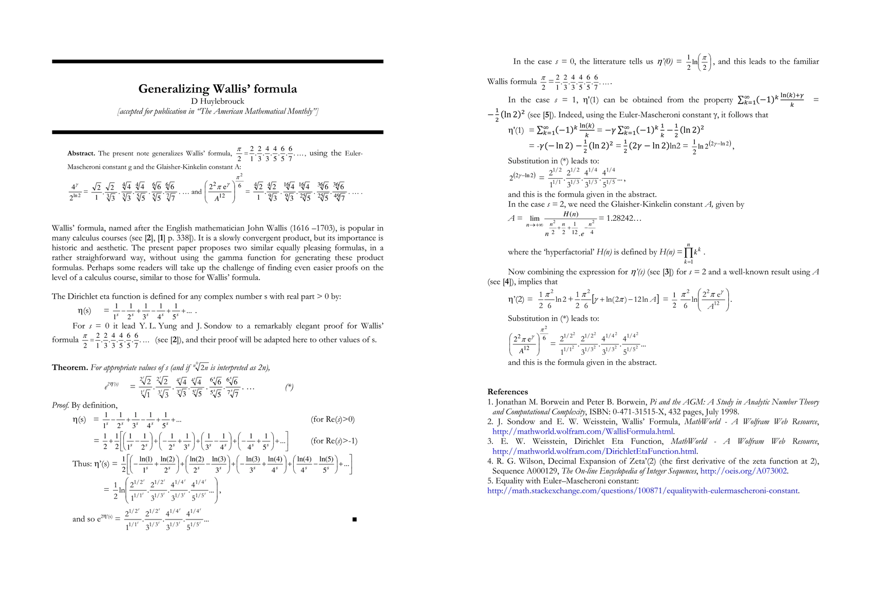 This paper generalizes Wallis formula for pi/2 using infinite products containing natural numbers and their roots, connecting it to Euler-Mascheroni and Glaisher-Kinkelin constants.