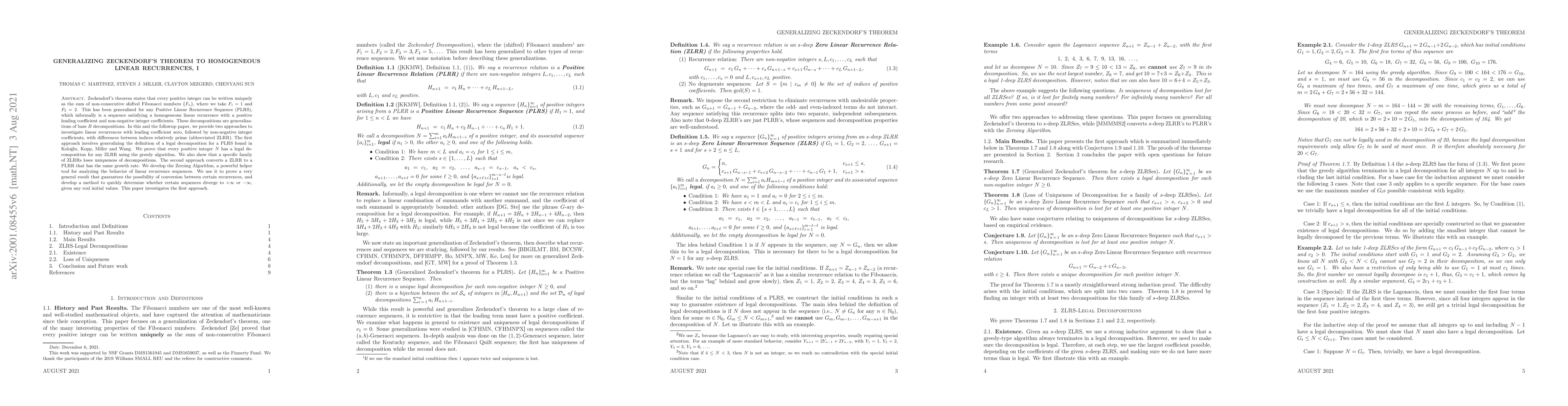 This paper generalizes Zeckendorf's theorem to homogeneous linear recurrence sequences with leading coefficient zero, termed ZLRRs. It proves the existence of a legal decomposition for any positive integer using the greedy algorithm, while also identifying a family of ZLRRs that lose uniqueness in decompositions.