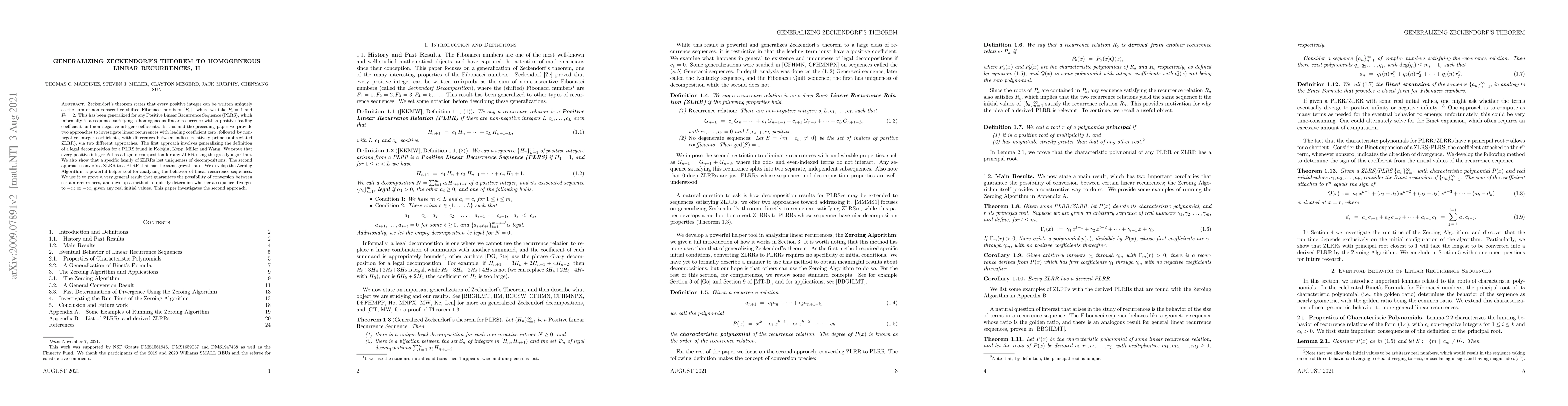 This paper explores a second approach to generalize Zeckendorf's theorem for linear recurrences with leading coefficient zero and non-negative integer coefficients, termed ZLRR. It develops the Zeroing Algorithm to analyze these sequences and proves that any positive integer has a legal decomposition via a greedy algorithm, while also identifying a family that loses uniqueness in decompositions.