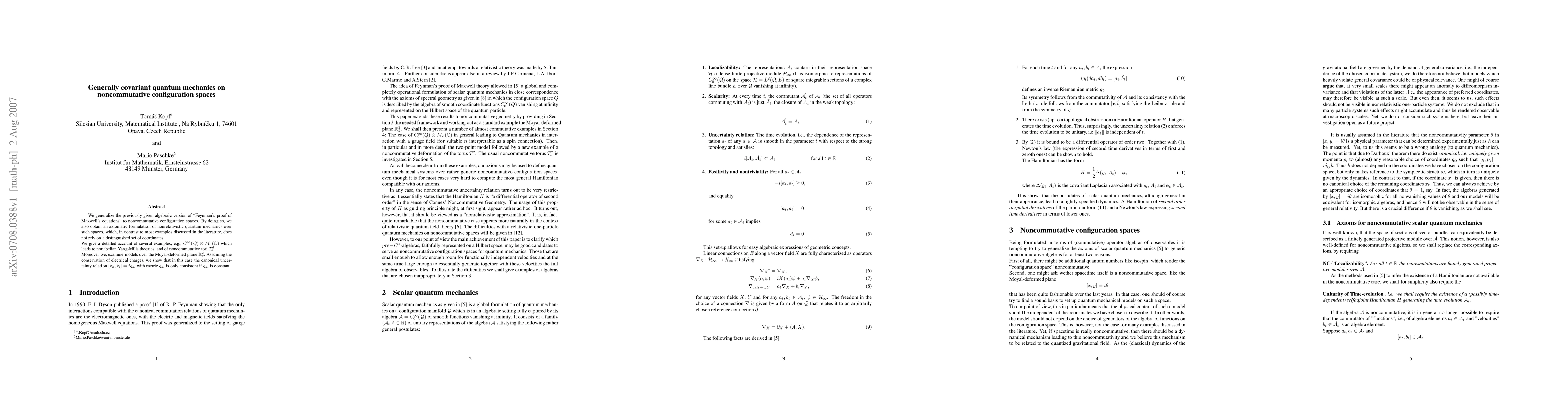 This paper generalizes Feynman's proof of Maxwell's equations to noncommutative configuration spaces, providing an axiomatic formulation of nonrelativistic quantum mechanics that does not depend on a specific coordinate system. It also explores various examples, including nonabelian Yang-Mills theories and noncommutative tori, and concludes that the canonical uncertainty relation is consistent only if the metric is constant under charge conservation.
