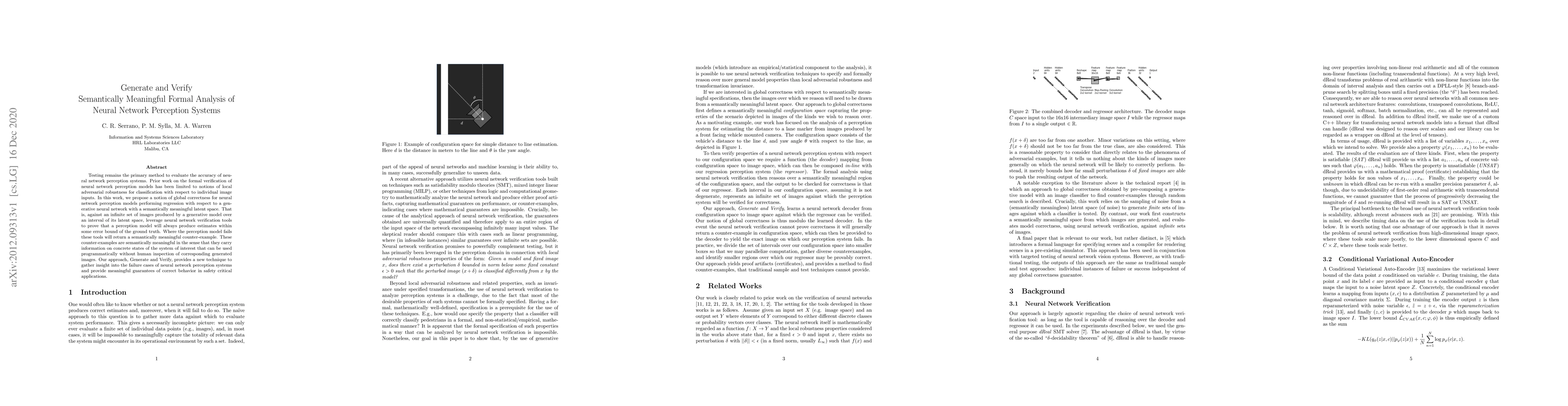 This paper proposes a new method called Generate and Verify for formally verifying the global correctness of neural network perception models performing regression. It aims to prove that the model will always produce estimates within an error bound of the ground truth against an infinite set of images from a generative model.