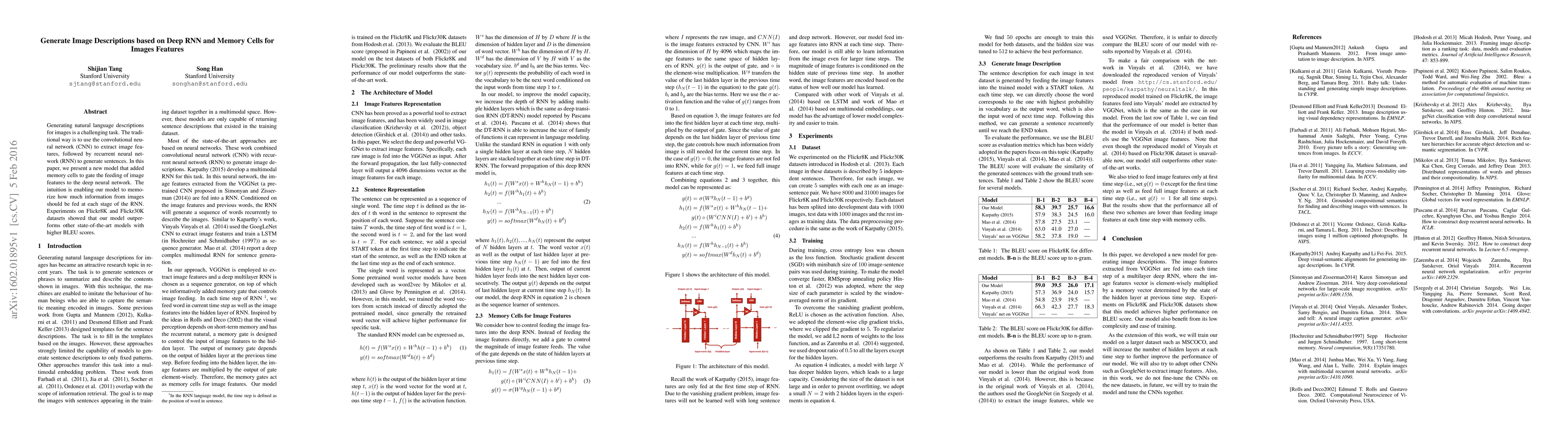This paper proposes a novel model that integrates memory cells with deep RNNs to generate image descriptions, outperforming existing methods on the Flickr8K and Flickr30K datasets with higher BLEU scores. The memory cells help the model to gate and optimize the feeding of image features during RNN processing.