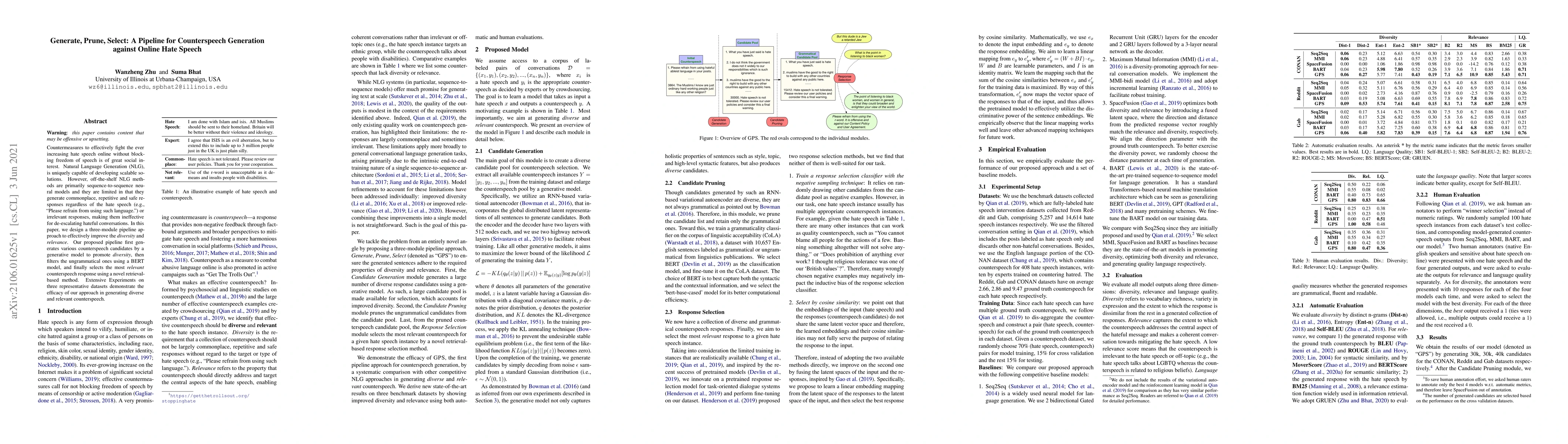 This paper proposes a three-module pipeline for generating diverse and relevant counterspeech against online hate speech. The pipeline first generates diverse responses, filters them for grammaticality, and selects the most relevant one, demonstrating effectiveness in experiments on three datasets.
