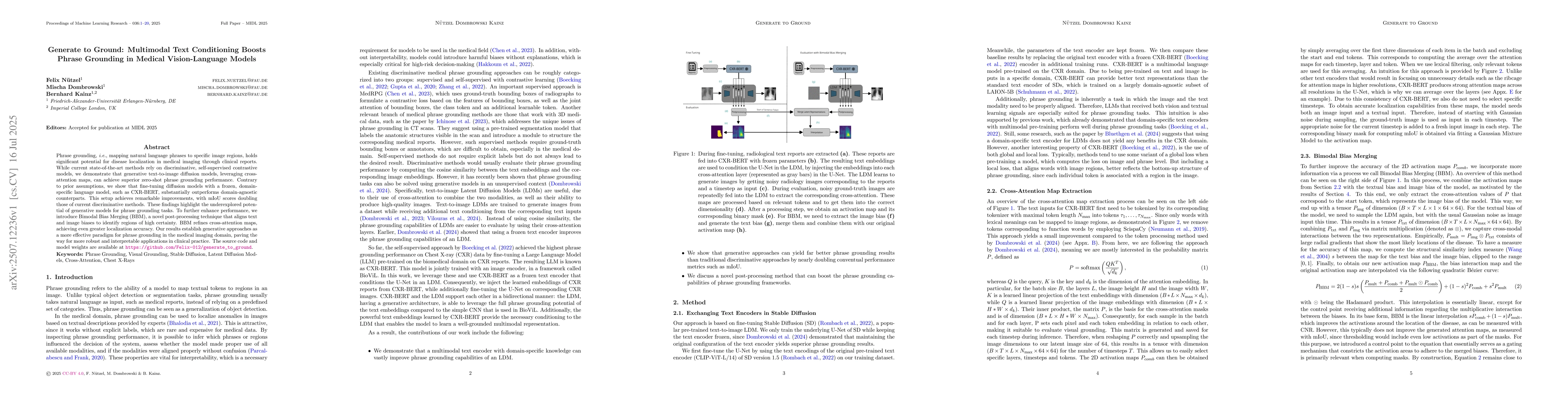 Phrase grounding, i.e., mapping natural language phrases to specific image regions, holds significant potential for disease localization in medical imaging through clinical reports. While current state-of-the-art methods rely on discriminative, self-supervised contrastive models, we demonstrate that generative text-to-image diffusion models, leveraging cross-attention maps, can achieve superior zero-shot phrase grounding performance. Contrary to prior assumptions, we show that fine-tuning diffusion models with a frozen, domain-specific language model, such as CXR-BERT, substantially outperforms domain-agnostic counterparts. This setup achieves remarkable improvements, with mIoU scores doubling those of current discriminative methods. These findings highlight the underexplored potential of generative models for phrase grounding tasks. To further enhance performance, we introduce Bimodal Bias Merging (BBM), a novel post-processing technique that aligns text and image biases to identify regions of high certainty. BBM refines cross-attention maps, achieving even greater localization accuracy. Our results establish generative approaches as a more effective paradigm for phrase grounding in the medical imaging domain, paving the way for more robust and interpretable applications in clinical practice. The source code and model weights are available at https://github.com/Felix-012/generate_to_ground.