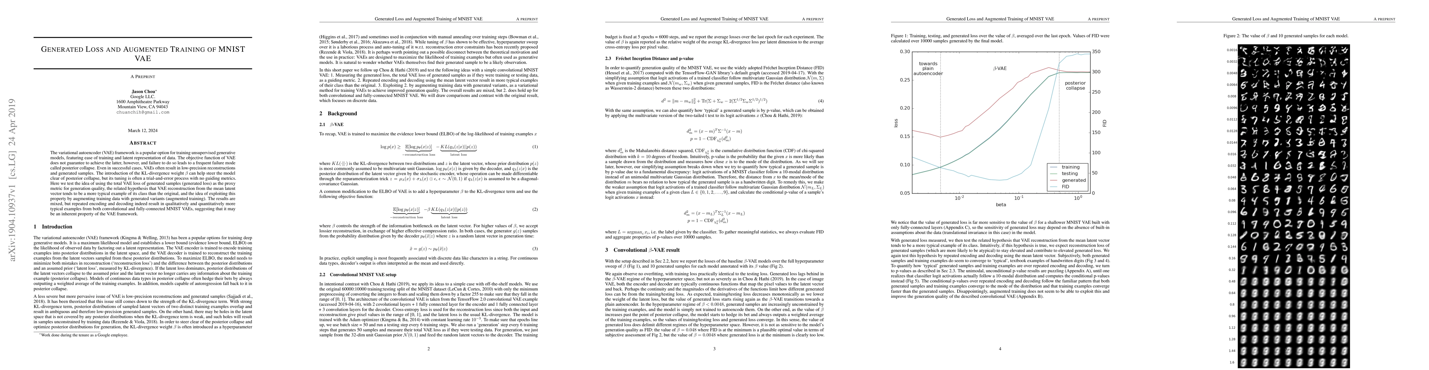 This research investigates the use of generated loss as a metric for tuning VAE models to avoid posterior collapse and improve reconstruction and generation quality. The study proposes augmenting training data with generated samples, finding that repeated encoding and decoding yield more typical class examples, suggesting this could be an inherent VAE property.