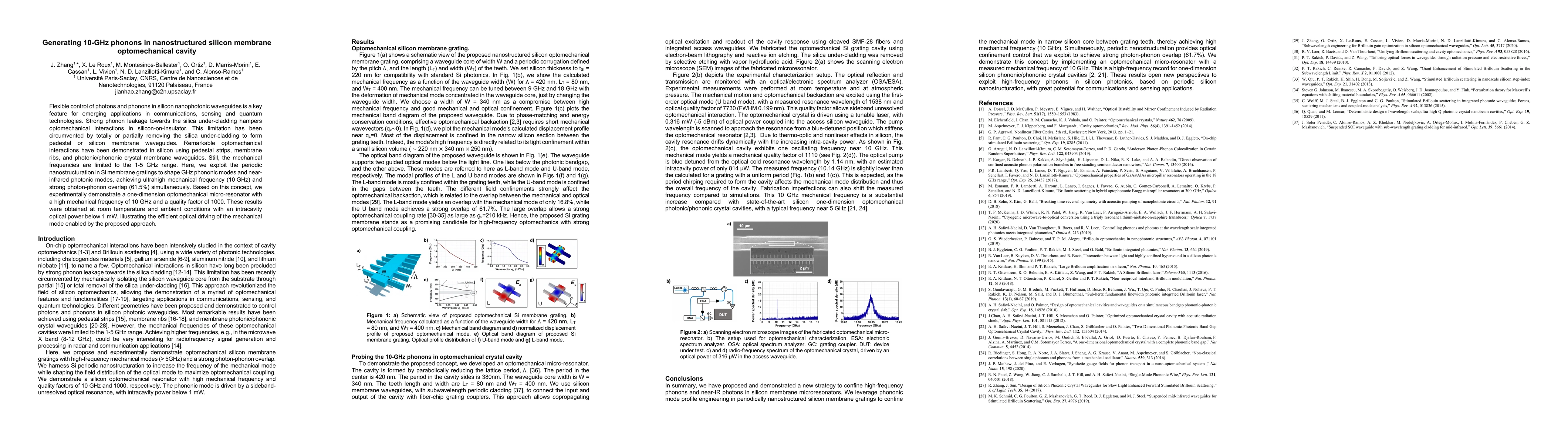This paper demonstrates the generation of 10-GHz phonons in a nanostructured silicon membrane optomechanical cavity, achieving high mechanical frequency and strong photon-phonon overlap through periodic nanostructuration. The experimental results show an optomechanical micro-resonator with a 10 GHz mechanical frequency and a quality factor of 1000, operating efficiently at room temperature and low optical power.