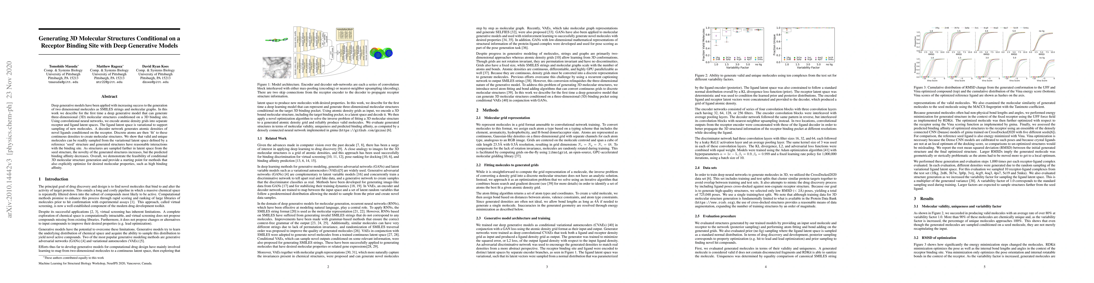 This paper introduces a deep generative model for generating 3D molecular structures based on receptor binding sites, using convolutional networks to encode atomic density grids. The model successfully produces novel molecules with reasonable binding interactions, though binding affinity decreases with structural novelty.