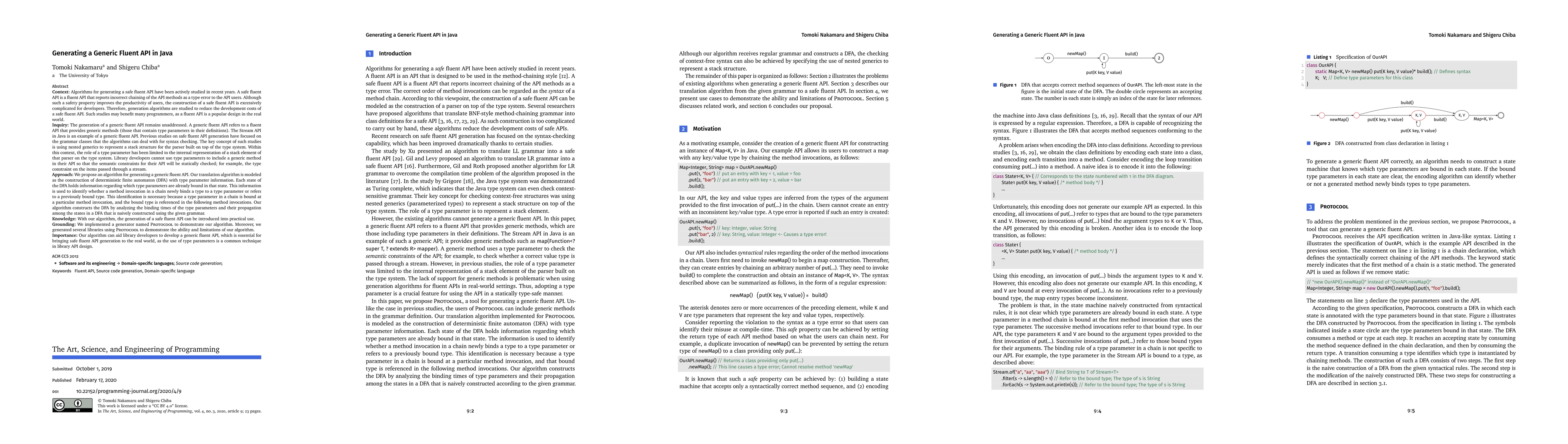 This paper proposes an algorithm to generate a generic fluent API in Java, addressing the challenge of safely managing type parameters within method chains. The algorithm constructs a deterministic finite automaton (DFA) to track type parameter bindings, enabling static semantic checks and reducing development costs for library developers.