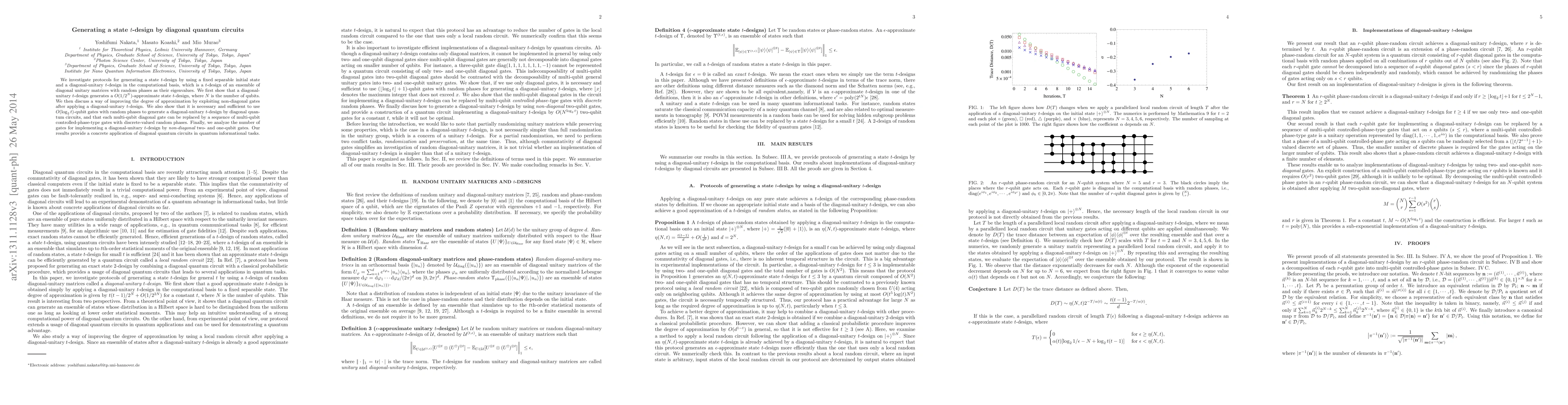 We investigate protocols for generating a state $t$-design by using a fixed separable initial state and a diagonal-unitary $t$-design in the computational basis, which is a $t$-design of an ensemble of diagonal unitary matrices with random phases as their eigenvalues. We first show that a diagonal-unitary $t$-design generates a $O(1/2^N)$-approximate state $t$-design, where $N$ is the number of qubits. We then discuss a way of improving the degree of approximation by exploiting non-diagonal gates after applying a diagonal-unitary $t$-design. We also show that it is necessary and sufficient to use $O(\log_2 t)$-qubit gates with random phases to generate a diagonal-unitary $t$-design by diagonal quantum circuits, and that each multi-qubit diagonal gate can be replaced by a sequence of multi-qubit controlled-phase-type gates with discrete-valued random phases. Finally, we analyze the number of gates for implementing a diagonal-unitary $t$-design by {\it non-diagonal} two- and one-qubit gates. Our results provide a concrete application of diagonal quantum circuits in quantum informational tasks.