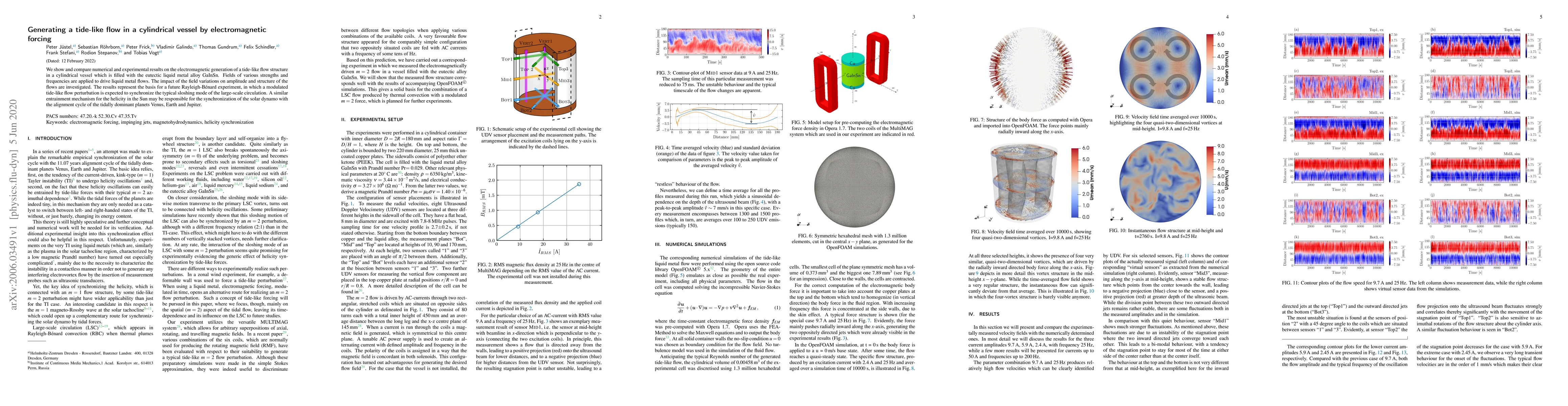 This paper investigates the electromagnetic generation of tide-like flow in a cylindrical vessel filled with GaInSn alloy using various field strengths and frequencies. The study combines numerical and experimental results to explore the impact of field variations on flow structure and amplitude, aiming to inform future Rayleigh-Bénard experiments and potentially explain synchronization mechanisms in the solar dynamo.