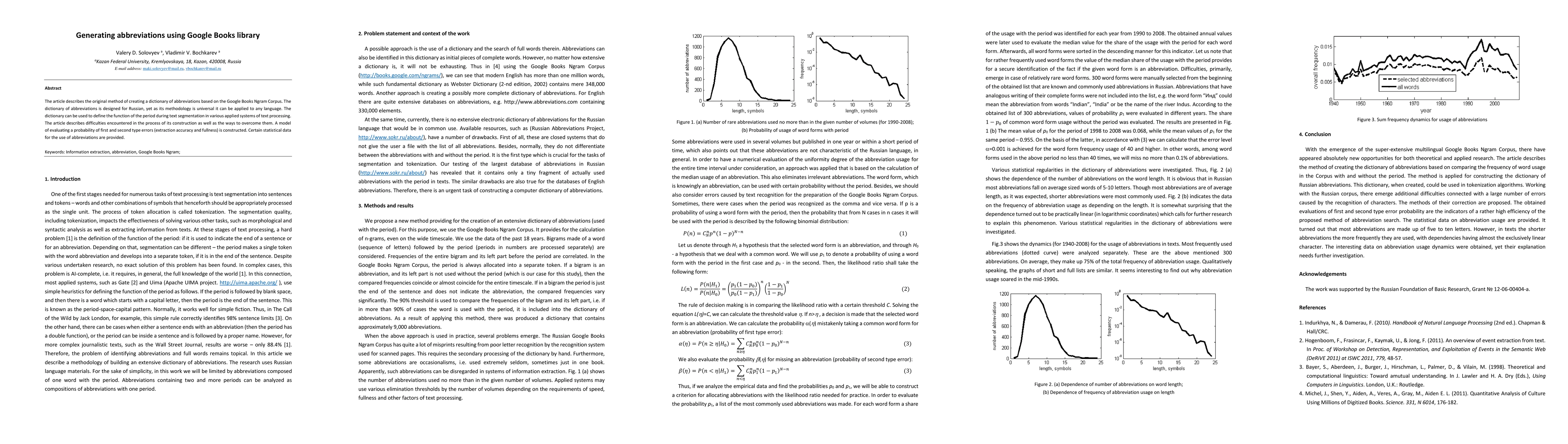 This paper presents a method for generating a universal dictionary of abbreviations using the Google Books Ngram Corpus, initially designed for Russian but adaptable to any language. The authors discuss challenges in constructing the dictionary and propose a model to evaluate extraction accuracy and completeness.