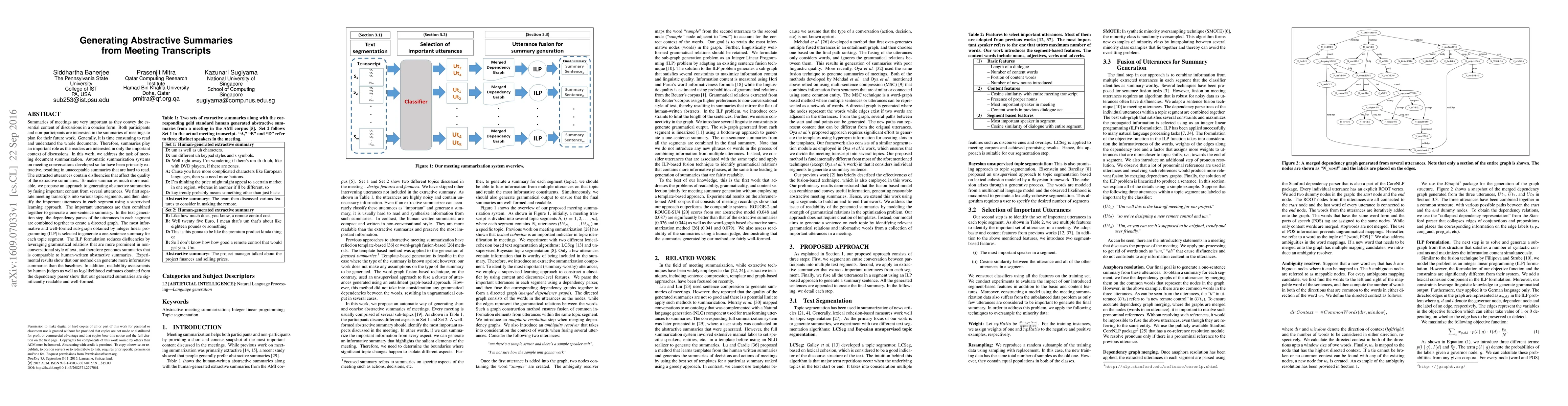 This paper proposes an abstractive summarization method for meeting transcripts, aiming to generate concise, readable summaries by fusing important content from multiple utterances. The approach uses supervised learning to identify key segments and utterances, followed by integer linear programming to create well-formed, disfluency-reduced summaries, outperforming extractive methods and baselines in readability and informativeness.
