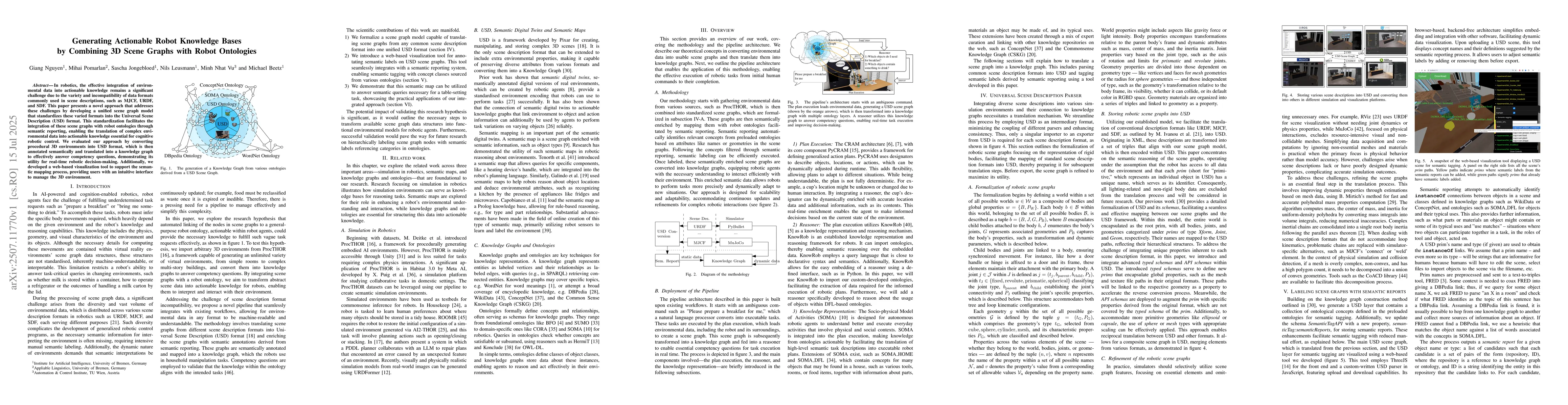 In robotics, the effective integration of environmental data into actionable knowledge remains a significant challenge due to the variety and incompatibility of data formats commonly used in scene descriptions, such as MJCF, URDF, and SDF. This paper presents a novel approach that addresses these challenges by developing a unified scene graph model that standardizes these varied formats into the Universal Scene Description (USD) format. This standardization facilitates the integration of these scene graphs with robot ontologies through semantic reporting, enabling the translation of complex environmental data into actionable knowledge essential for cognitive robotic control. We evaluated our approach by converting procedural 3D environments into USD format, which is then annotated semantically and translated into a knowledge graph to effectively answer competency questions, demonstrating its utility for real-time robotic decision-making. Additionally, we developed a web-based visualization tool to support the semantic mapping process, providing users with an intuitive interface to manage the 3D environment.