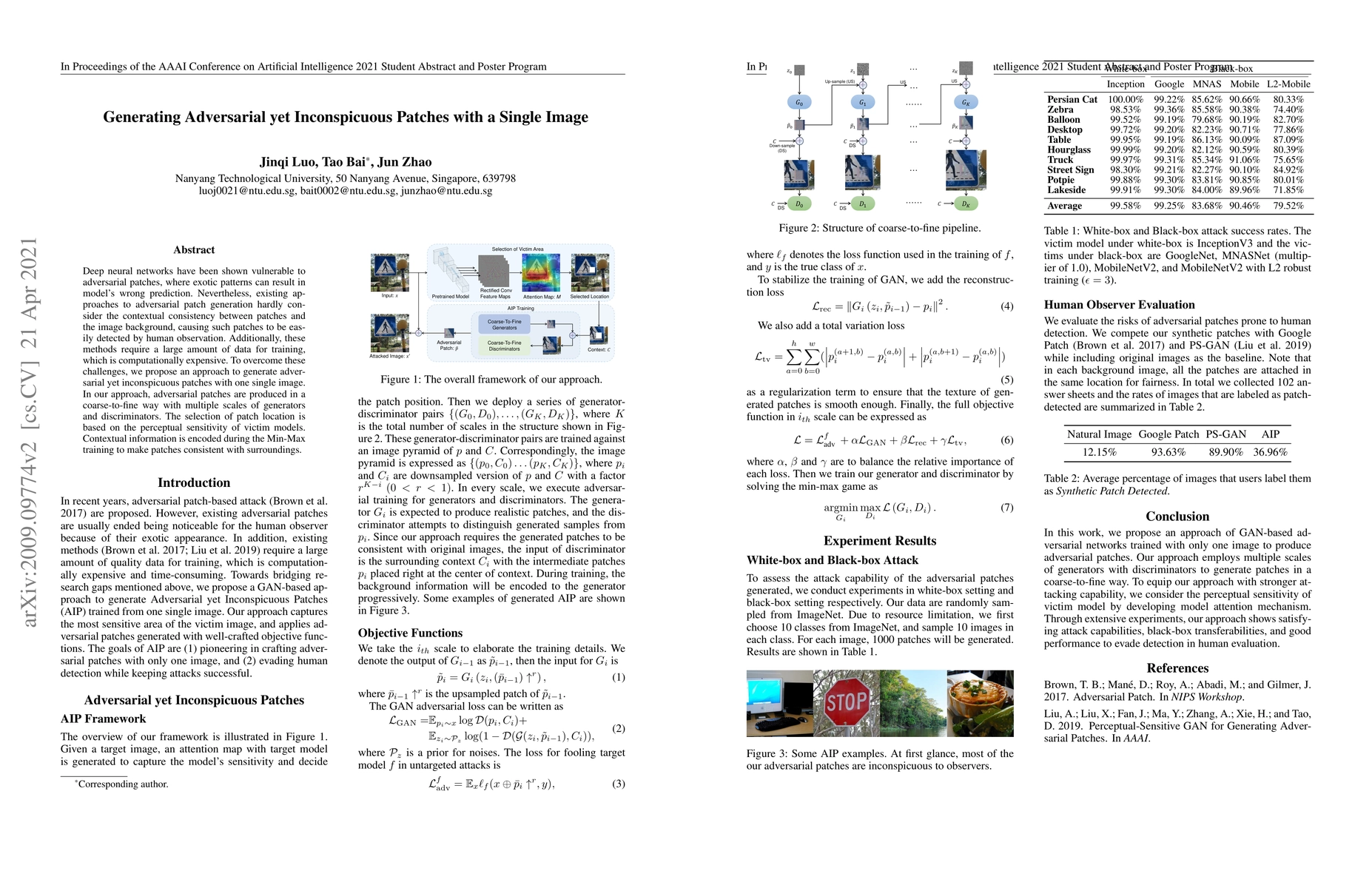 Deep neural networks have been shown vulnerable toadversarial patches, where exotic patterns can resultin models wrong prediction. Nevertheless, existing ap-proaches to adversarial patch generation hardly con-sider the contextual consistency between patches andthe image background, causing such patches to be eas-ily detected and adversarial attacks to fail. On the otherhand, these methods require a large amount of data fortraining, which is computationally expensive. To over-come these challenges, we propose an approach to gen-erate adversarial yet inconspicuous patches with onesingle image. In our approach, adversarial patches areproduced in a coarse-to-fine way with multiple scalesof generators and discriminators. Contextual informa-tion is encoded during the Min-Max training to makepatches consistent with surroundings. The selection ofpatch location is based on the perceptual sensitivity ofvictim models. Through extensive experiments, our ap-proach shows strong attacking ability in both the white-box and black-box setting. Experiments on saliency de-tection and user evaluation indicate that our adversar-ial patches can evade human observations, demonstratethe inconspicuousness of our approach. Lastly, we showthat our approach preserves the attack ability in thephysical world.