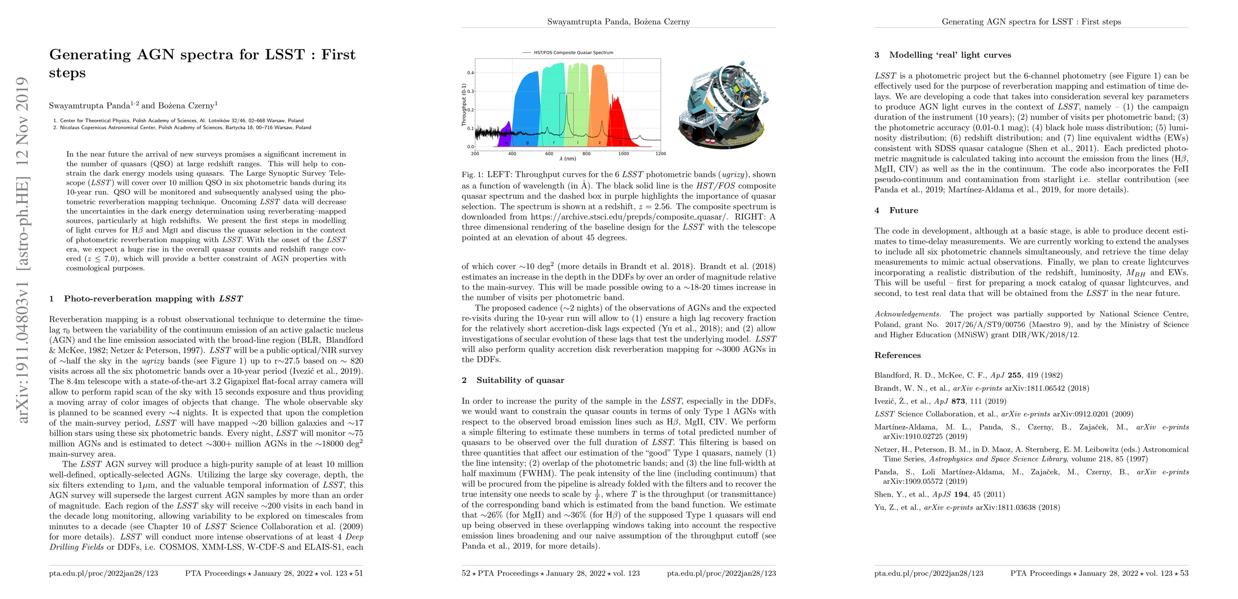 This paper outlines initial efforts to model AGN spectra for the Large Synoptic Survey Telescope (LSST), focusing on quasars' light curves in H$\beta$ and MgII. It discusses the anticipated increase in quasar counts and redshift range, aiming to improve dark energy model constraints using photometric reverberation mapping.