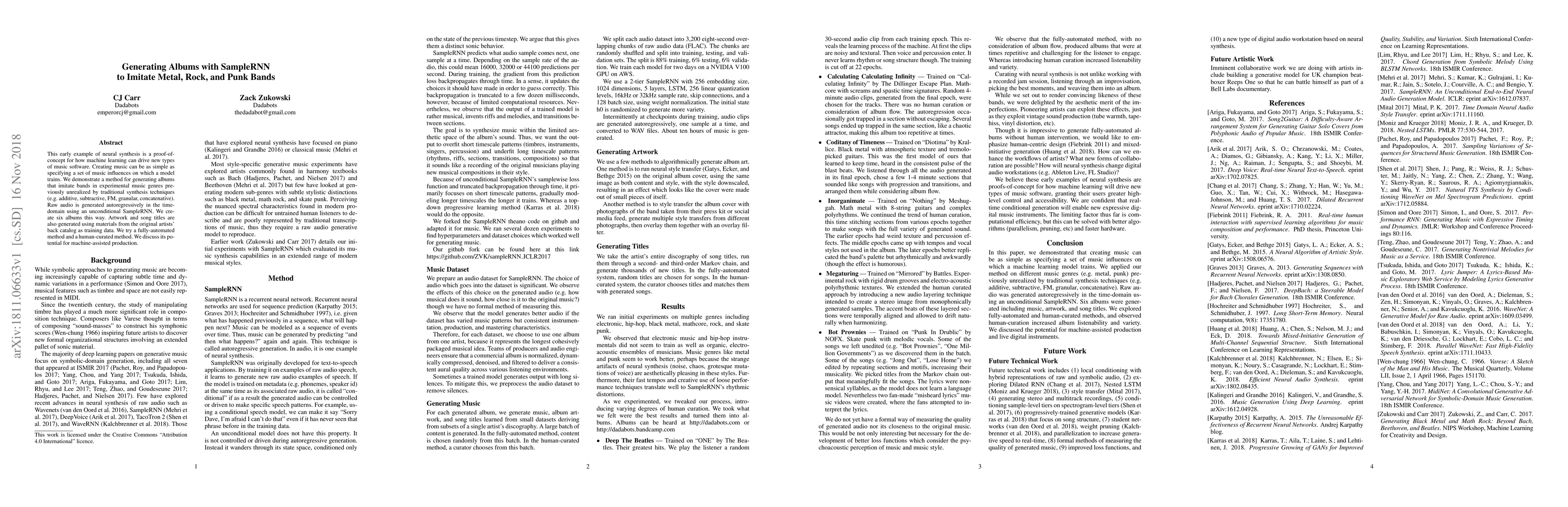 This early example of neural synthesis is a proof-of-concept for how machine learning can drive new types of music software. Creating music can be as simple as specifying a set of music influences on which a model trains. We demonstrate a method for generating albums that imitate bands in experimental music genres previously unrealized by traditional synthesis techniques (e.g. additive, subtractive, FM, granular, concatenative). Raw audio is generated autoregressively in the time-domain using an unconditional SampleRNN. We create six albums this way. Artwork and song titles are also generated using materials from the original artists' back catalog as training data. We try a fully-automated method and a human-curated method. We discuss its potential for machine-assisted production.