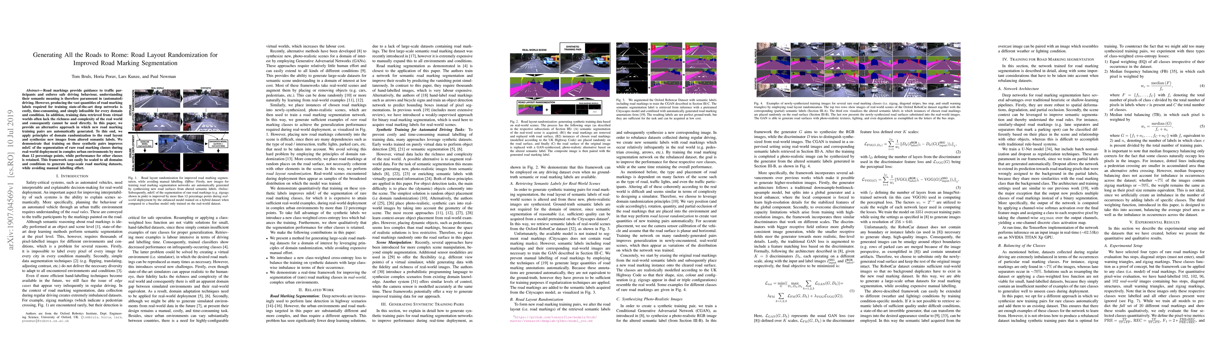 This paper proposes a method to generate synthetic road marking training data through road layout randomization, improving the segmentation of rare road marking classes by over 12 percentage points in complex urban environments. This approach avoids the costly manual labeling process and can scale to various domains and conditions.