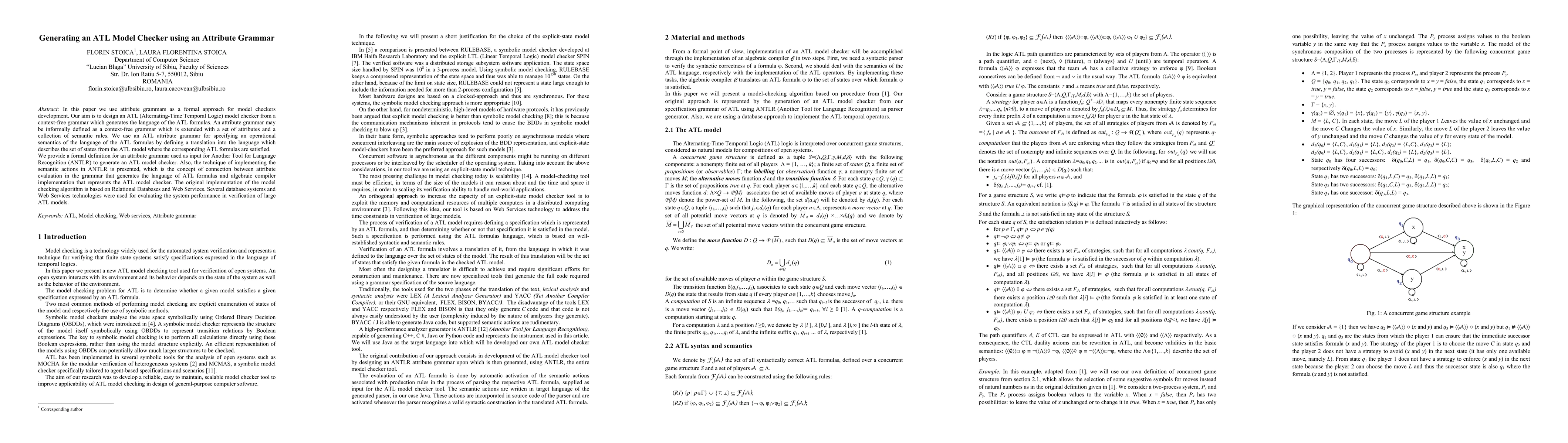 This paper develops an ATL model checker using attribute grammars, specifying the operational semantics of ATL formulas through an extended context-free grammar. The implementation leverages ANTLR for generating the model checker and evaluates its performance using relational databases and web services.