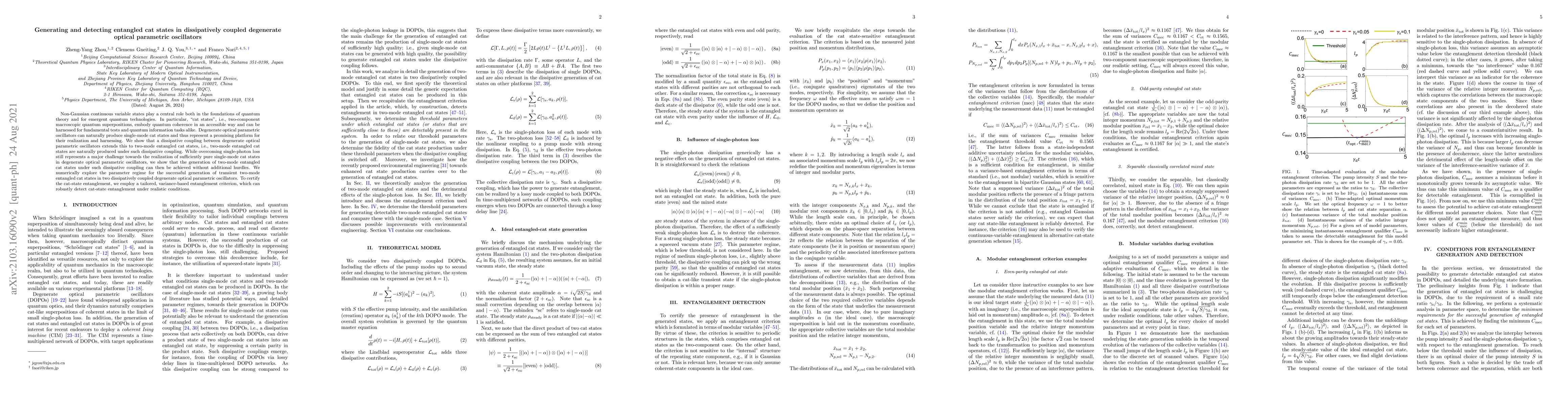 This paper demonstrates the generation of two-mode entangled cat states through dissipative coupling between degenerate optical parametric oscillators, overcoming challenges in single-mode cat state purity. A variance-based entanglement criterion is used to robustly detect the entanglement of these cat states under realistic conditions.
